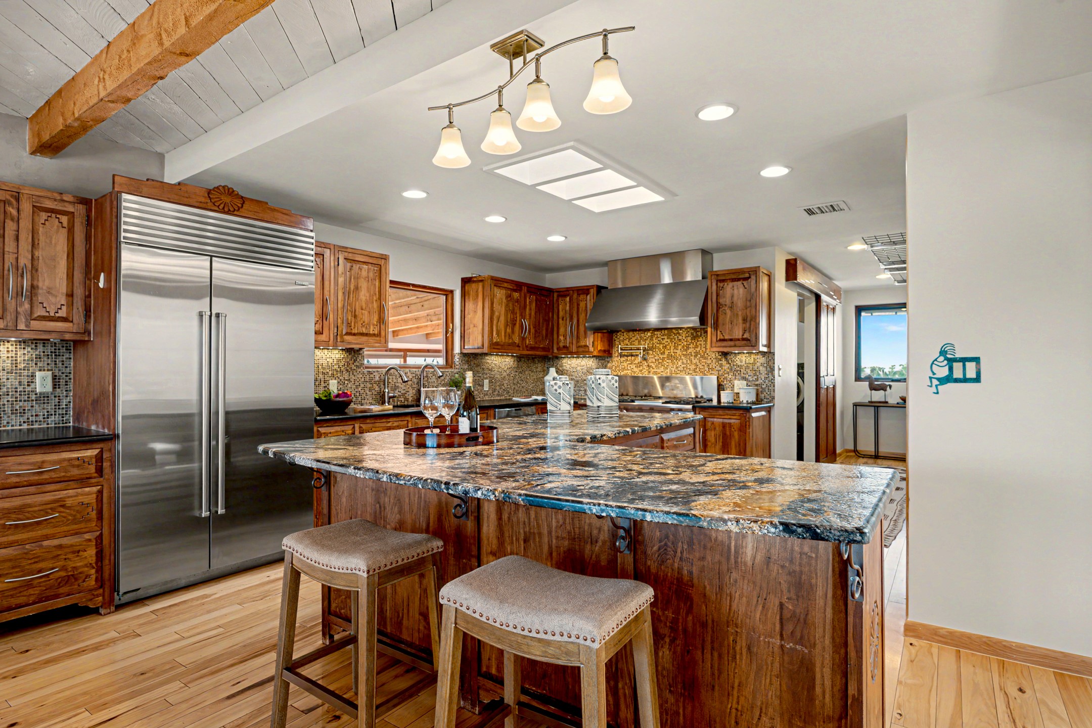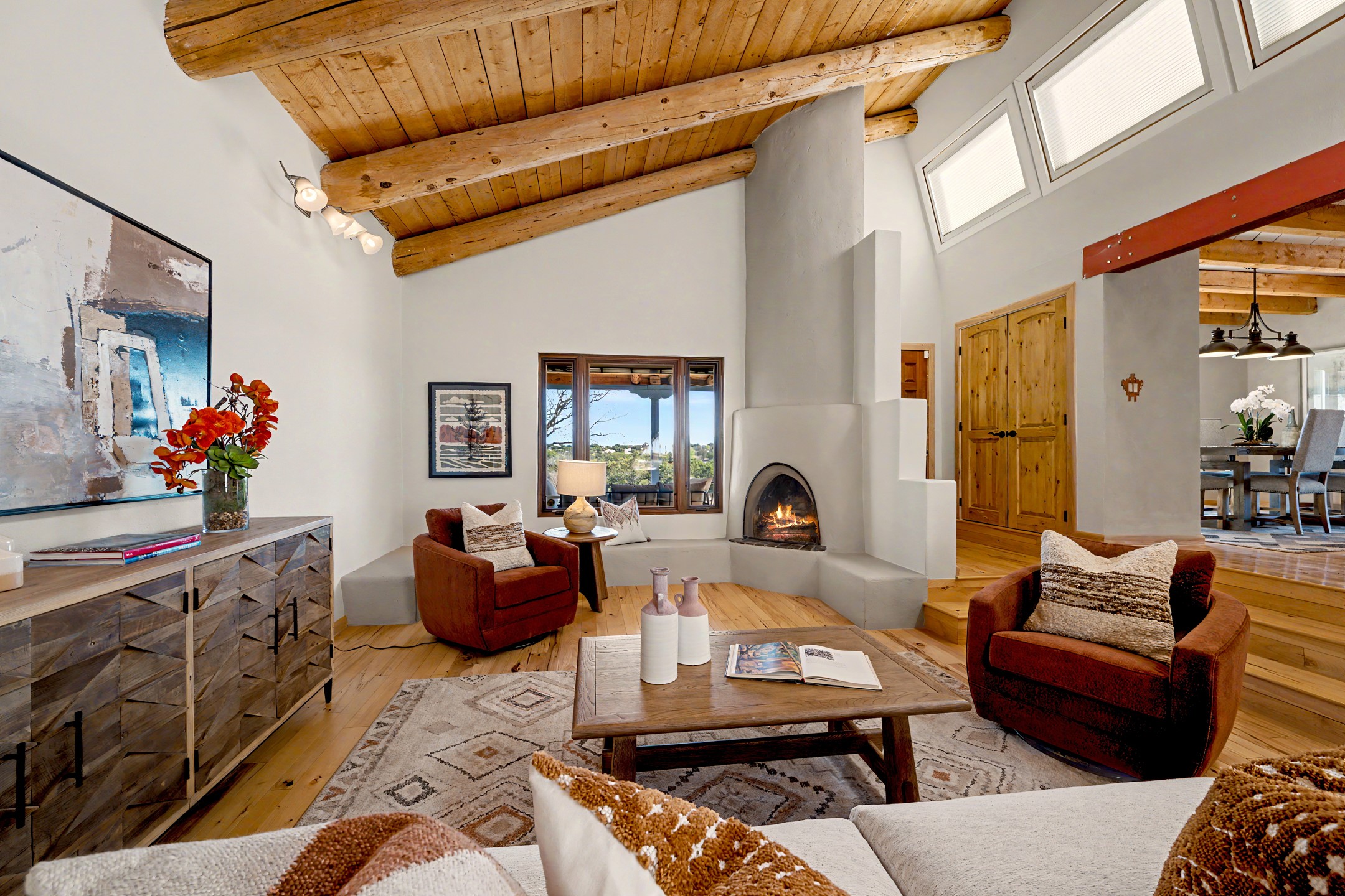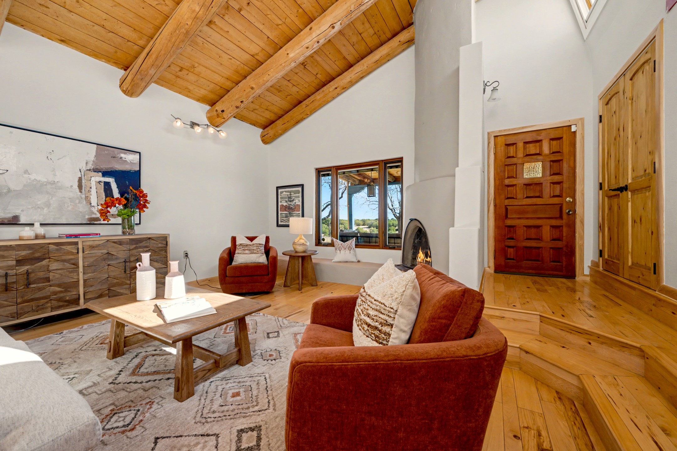 Set on 5 acres and just 20 minutes to downtown Santa Fe, this exceptional property offers breathtaking 360-degree mountain views and an ideal blend of comfort, versatility, and New Mexico charm. The 3-bedroom, 2-bath home includes a dedicated office, large sunroom flanked by a walled courtyard and is extensively renovated, showcasing quality, craftsmanship and thoughtful upgrades.The beautifully updated kitchen features custom maple wood cabinetry, copper sink, large center island with seating, granite countertops, and premium appliances: a six burner 42" Wolf gas stove with grill and double oven along with Sub-Zero.The spacious primary suite offers a luxurious bath complete with dual steam/shower for two, jetted tub with granite surround, travertine tile walls, vanity with granite-top and updated fixtures plus a custom solid hardwood closet system. Additional improvements include hickory wood flooring throughout, Pella triple-pane windows, solid alder wood interior doors, and an upgraded laundry room with maple cabinetry, granite counter and slate tile flooring. This home has underground electric and natural gas, a newer septic, private well with 3-acre feet of water registered with the NM State Engineer, newer bitumen roof and two-zoned forced heat/refrigerated air for year-round comfort & instant tankless water heater. Beyond the main residence, the property features a two-story studio, 1,000 sq.ft. total perfect for creative pursuits or a home business. Additionally, a 2,500 square foot outbuilding for a tradesman or large workshop with ample parking.For the horseman, rancher or privacy seeker, there is a contiguous, transferable, fenced 40-acre land lease from the NM Land Commissioner at a $50 yearly rent. Horses can run free to graze. Permission for future stables or other structures on the leasehold can be had with the investment cost returnable.This property offers a rare opportunity to enjoy peaceful rural living with easy access to Santa Fe's amenities.