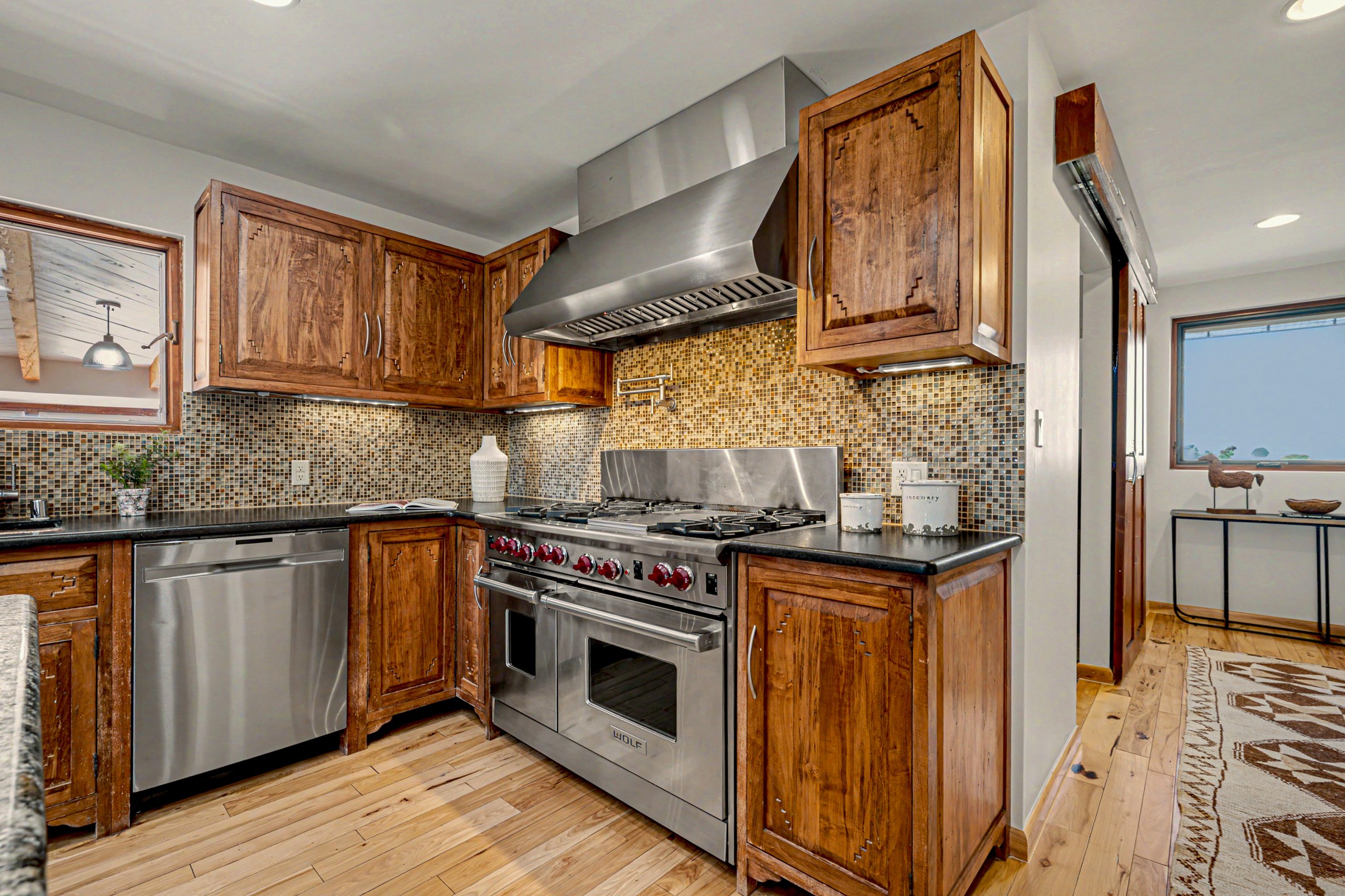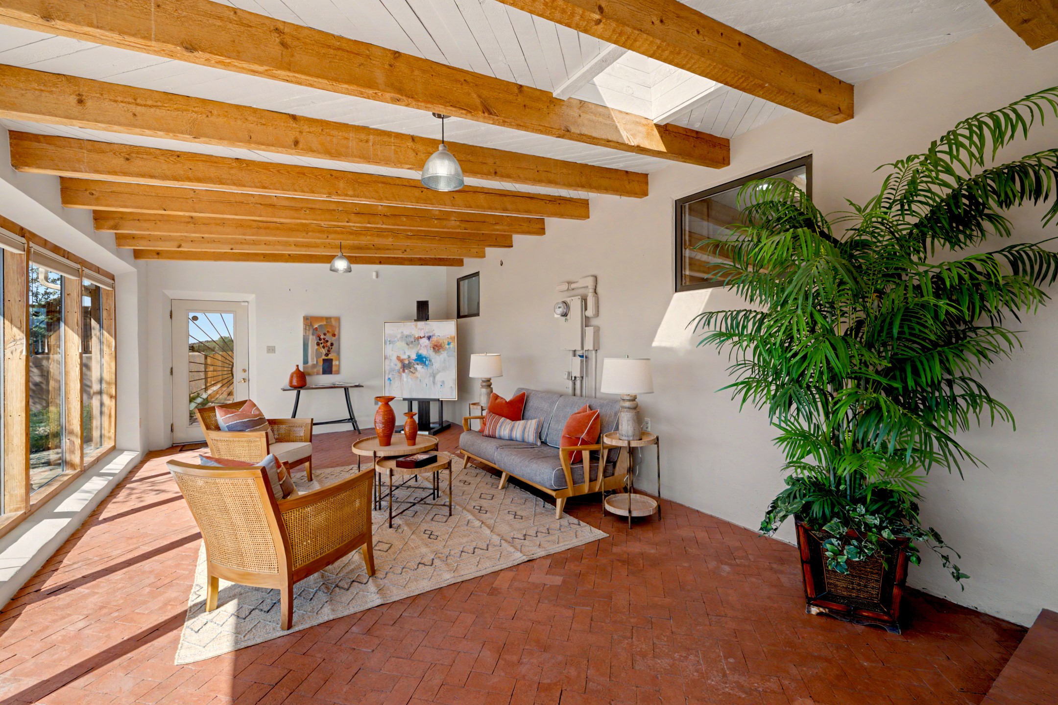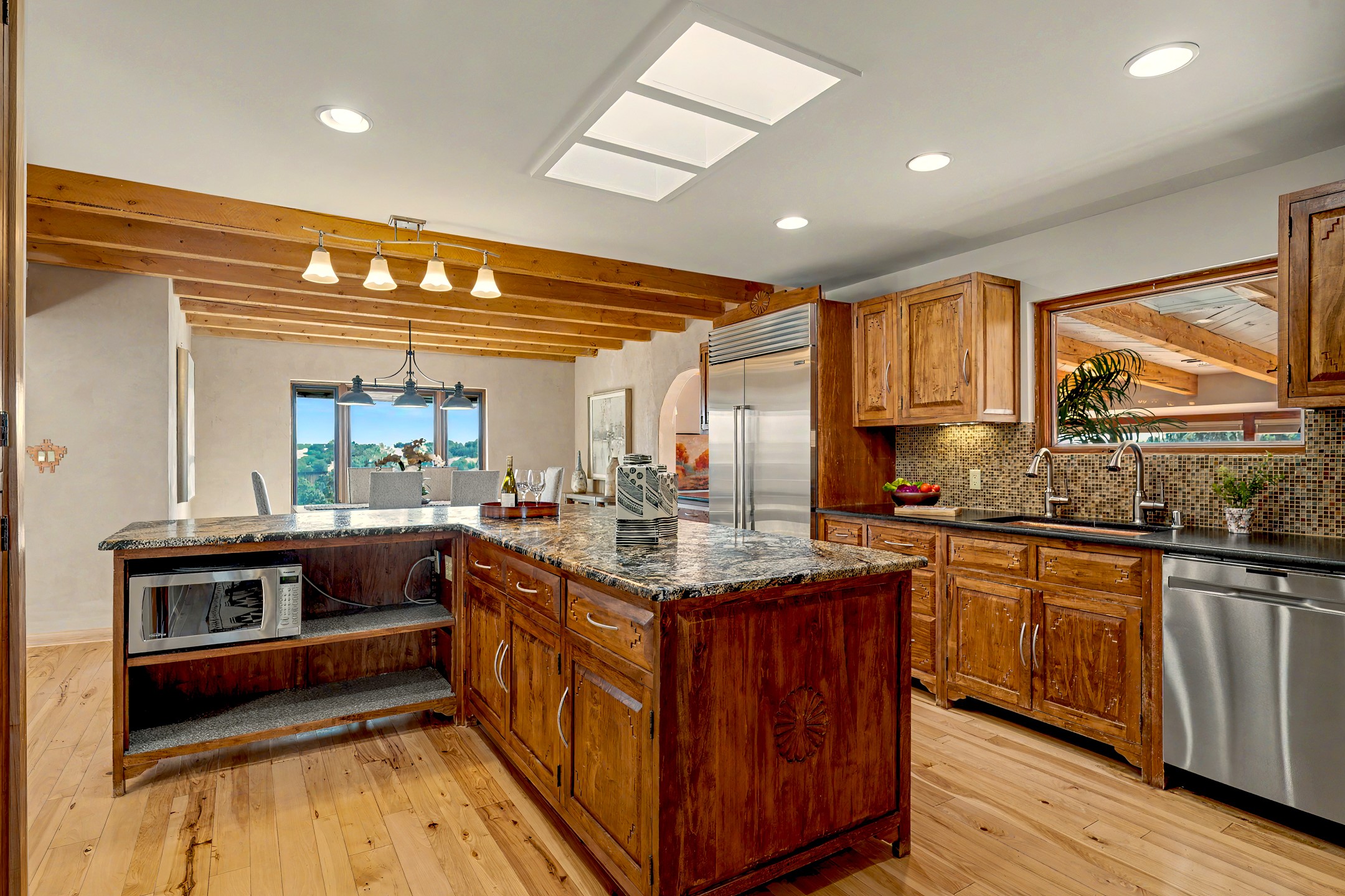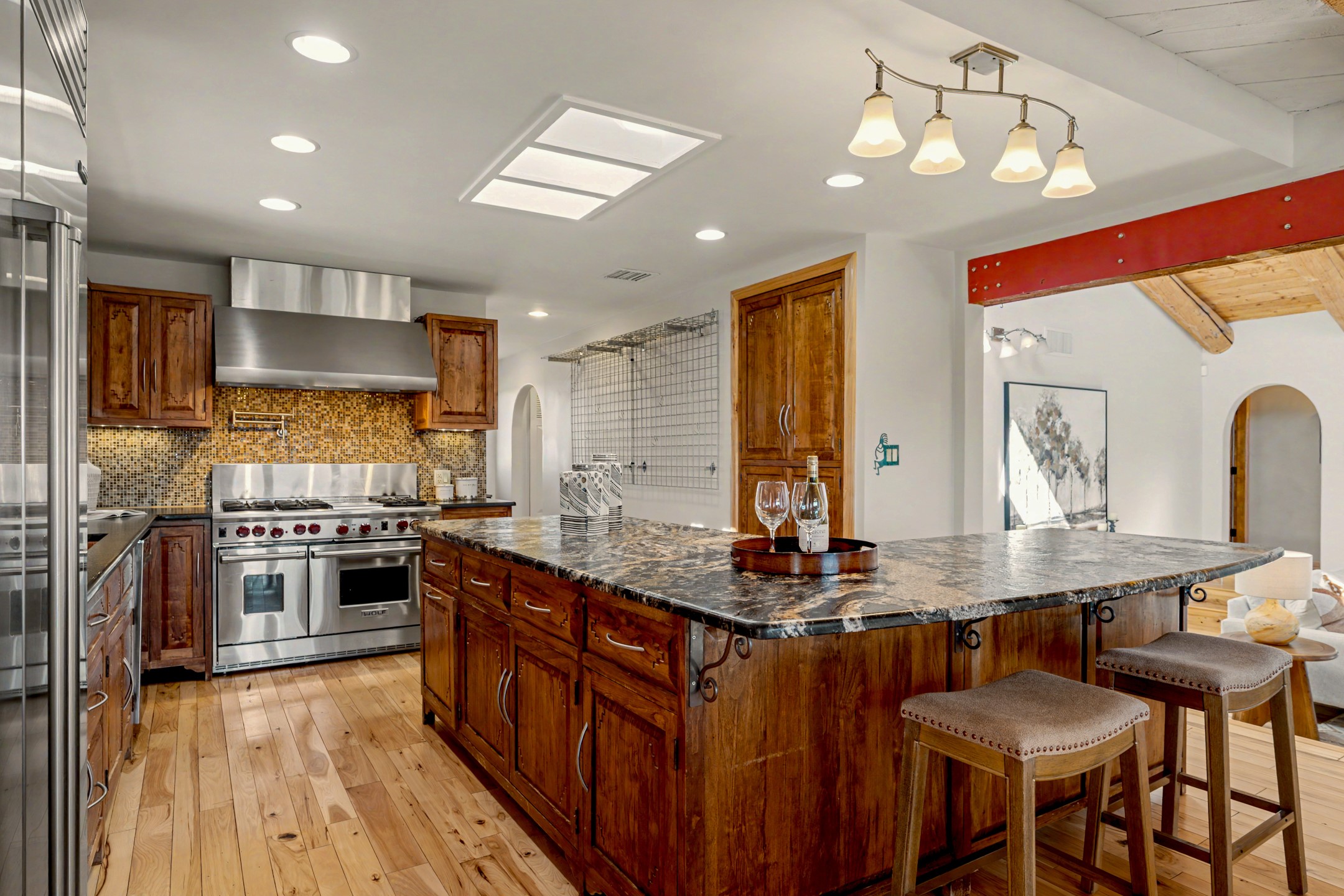 Set on 5 acres and just 20 minutes to downtown Santa Fe, this exceptional property offers breathtaking 360-degree mountain views and an ideal blend of comfort, versatility, and New Mexico charm. The 3-bedroom, 2-bath home includes a dedicated office, large sunroom flanked by a walled courtyard and is extensively renovated, showcasing quality, craftsmanship and thoughtful upgrades.The beautifully updated kitchen features custom maple wood cabinetry, copper sink, large center island with seating, granite countertops, and premium appliances: a six burner 42" Wolf gas stove with grill and double oven along with Sub-Zero.The spacious primary suite offers a luxurious bath complete with dual steam/shower for two, jetted tub with granite surround, travertine tile walls, vanity with granite-top and updated fixtures plus a custom solid hardwood closet system. Additional improvements include hickory wood flooring throughout, Pella triple-pane windows, solid alder wood interior doors, and an upgraded laundry room with maple cabinetry, granite counter and slate tile flooring. This home has underground electric and natural gas, a newer septic, private well with 3-acre feet of water registered with the NM State Engineer, newer bitumen roof and two-zoned forced heat/refrigerated air for year-round comfort & instant tankless water heater. Beyond the main residence, the property features a two-story studio, 1,000 sq.ft. total perfect for creative pursuits or a home business. Additionally, a 2,500 square foot outbuilding for a tradesman or large workshop with ample parking.For the horseman, rancher or privacy seeker, there is a contiguous, transferable, fenced 40-acre land lease from the NM Land Commissioner at a $50 yearly rent. Horses can run free to graze. Permission for future stables or other structures on the leasehold can be had with the investment cost returnable.This property offers a rare opportunity to enjoy peaceful rural living with easy access to Santa Fe's amenities.