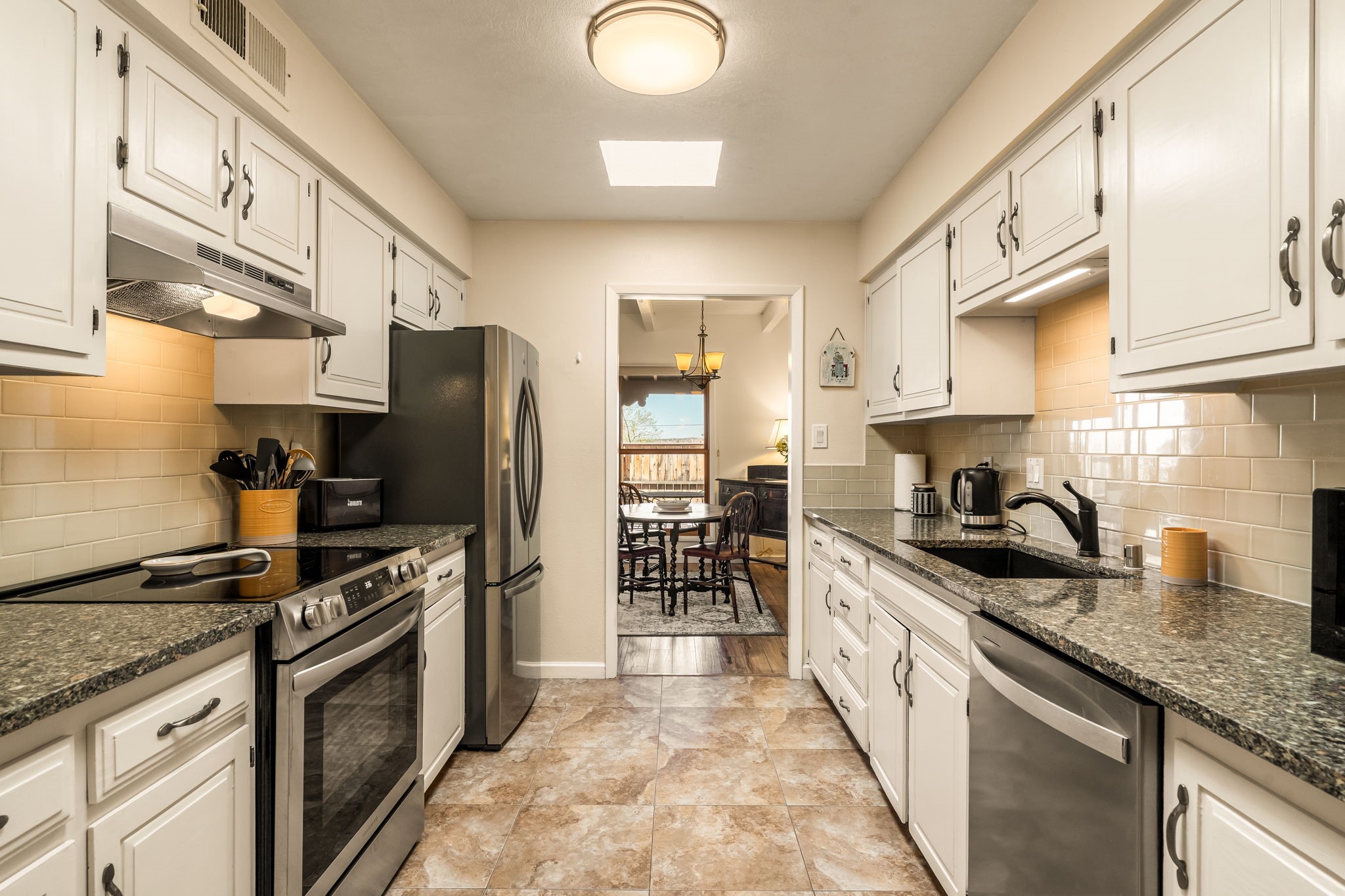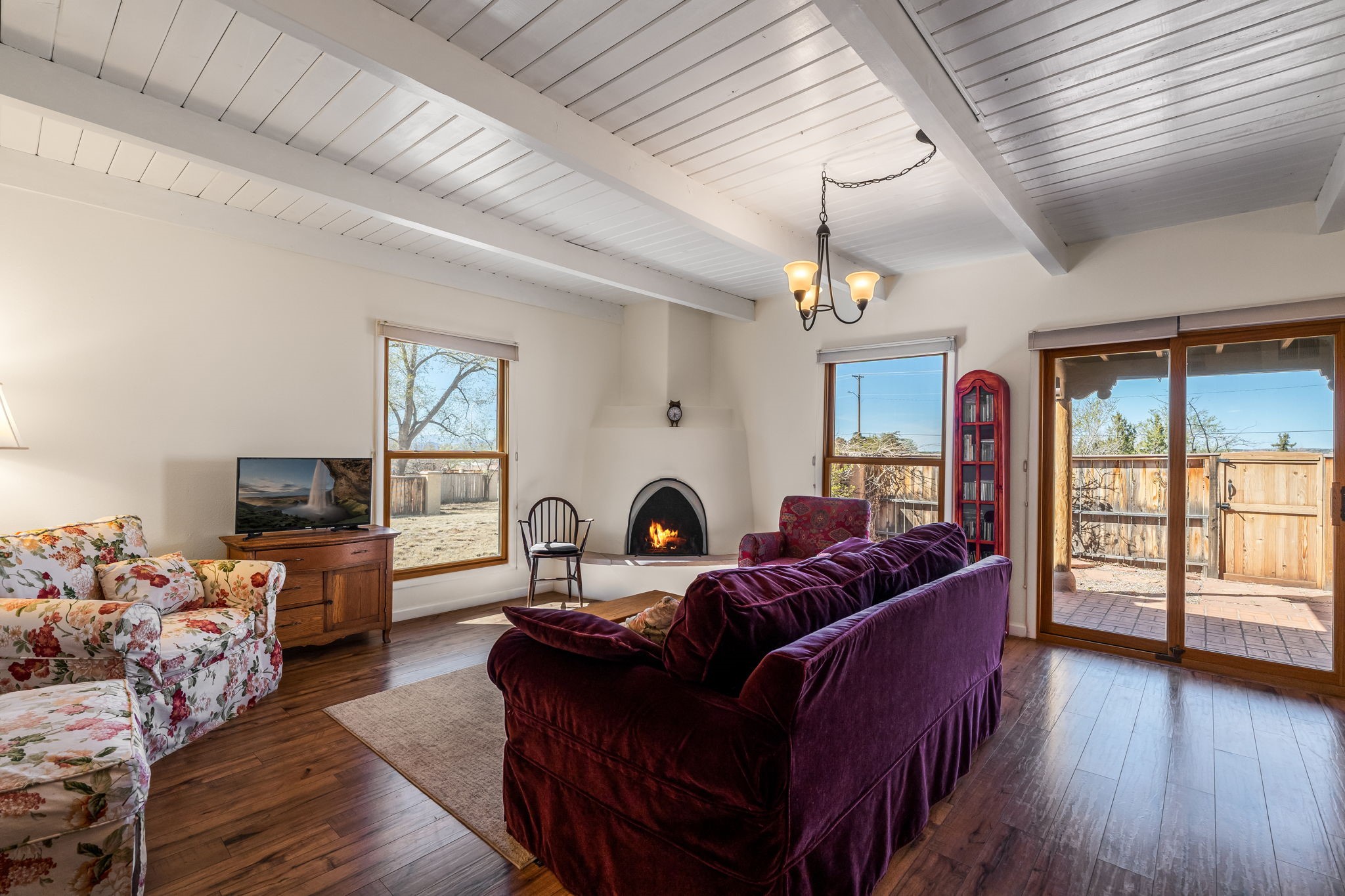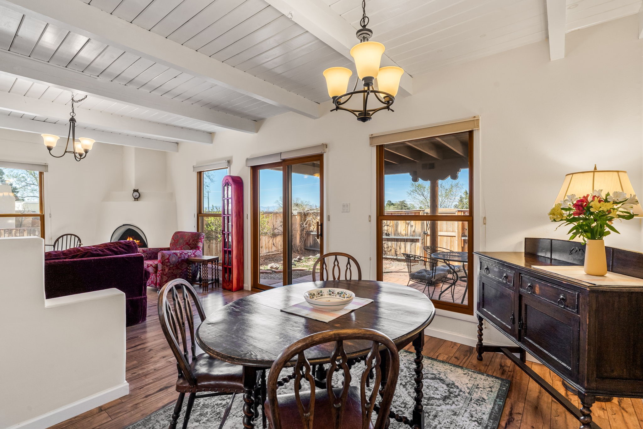 Filled with natural light and lovingly cared for over the past 30 years, this inviting single-story townhouse offers comfort, beauty, and an exceptional Park Plazas setting. With open space on three sides, the home enjoys a wonderful sense of privacy along with views of the Jemez Mountains, where sunsets are especially beautiful, as well as glimpses of the Sangre de Cristo range. Inside, the living and dining room feel warm and welcoming with beautiful laminate flooring, a corner Kiva fireplace, and sliding doors that open to a covered portal--an ideal place to relax and take in the surroundings. The kitchen has been thoughtfully updated with newer appliances, including a convection oven, Silestone countertops, a subway tile backsplash, a granite composite farm sink, and two skylights that bring in even more light. A sunny breakfast area with a cozy window seat adds to the home's charm. The spacious primary bedroom is bright and peaceful, and the updated bath features granite counters and a beautifully tiled walk-in shower. Additionally, there is a lovely second bedroom and full bath as well as a detached 2 car garage. This home is sparkling and ready for its new owner. Located in the centrally situated Park Plazas neighborhood, residents enjoy miles of walking trails, tennis courts, an off-leash dog park, and easy access to shopping, dining, and the Santa Fe Plaza.