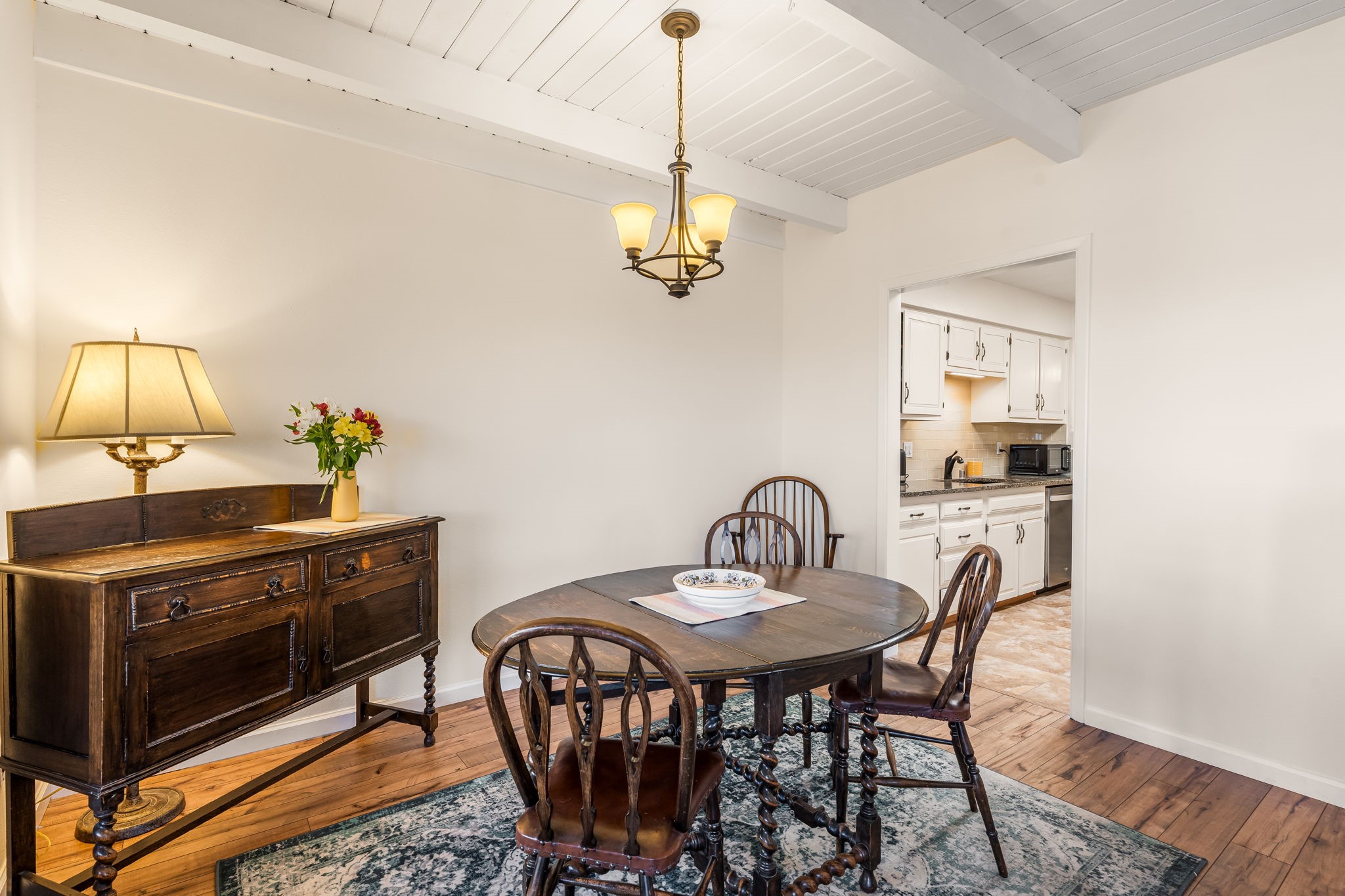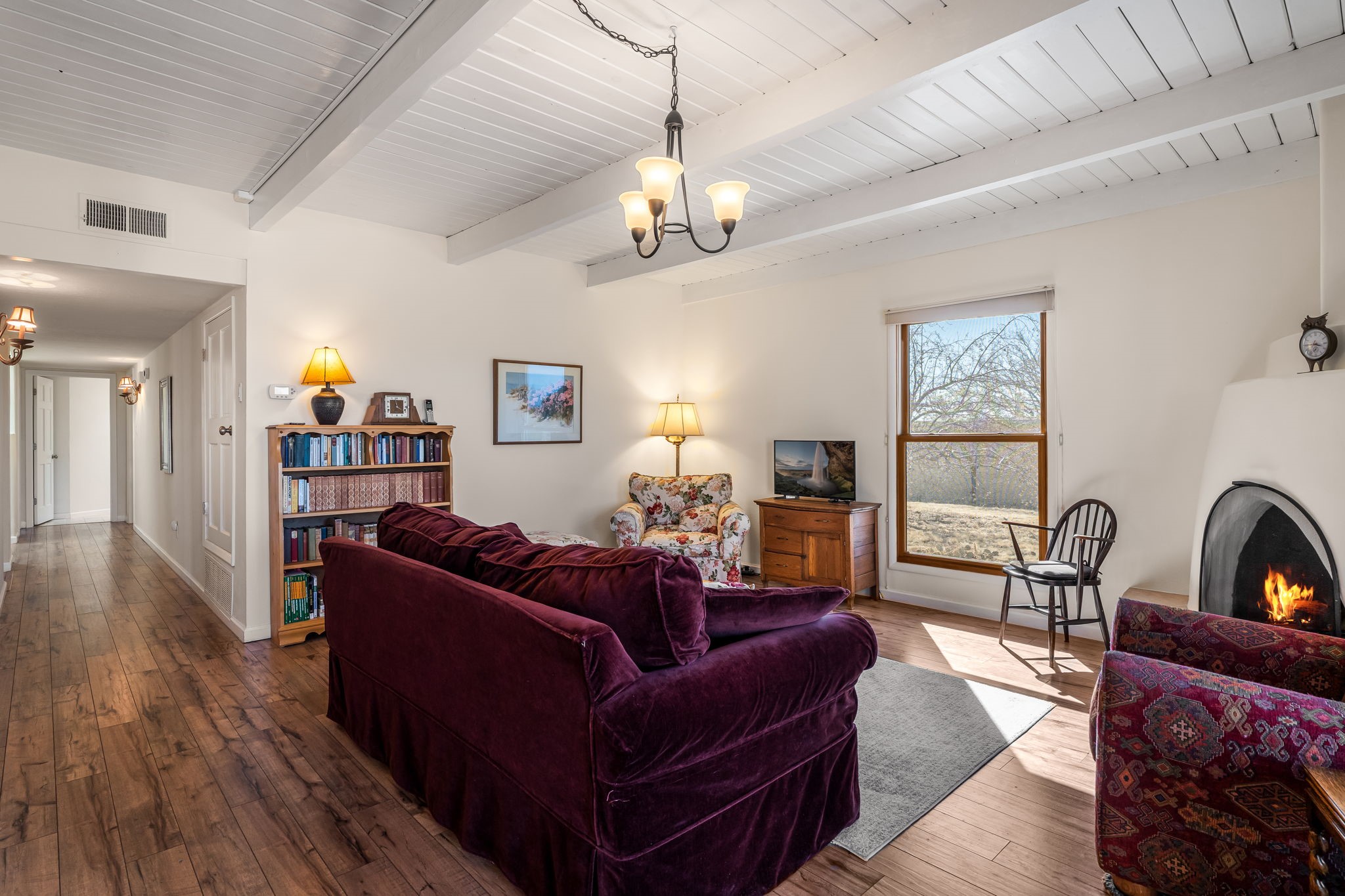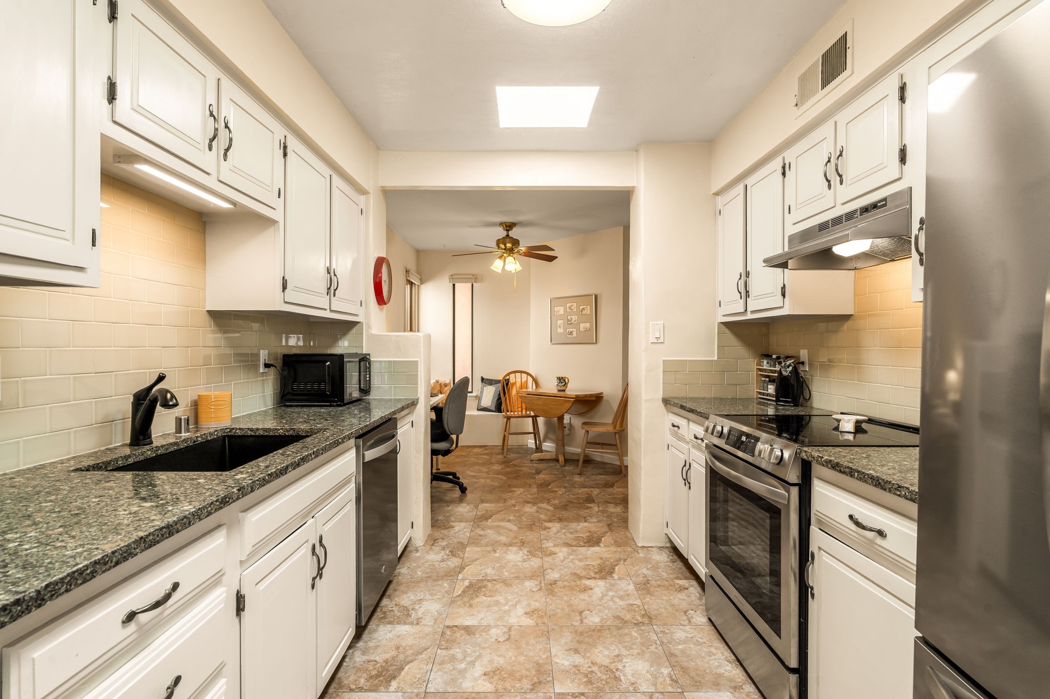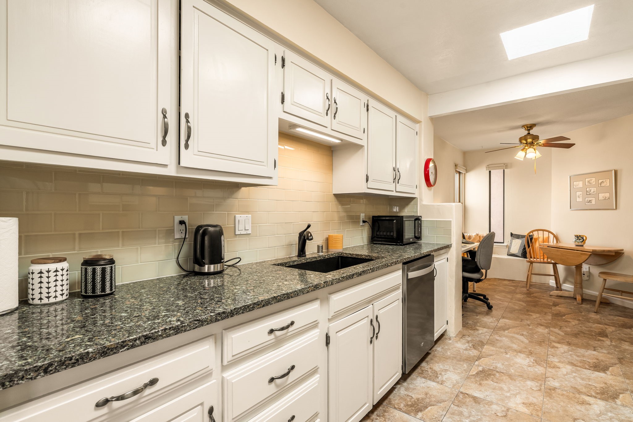 Filled with natural light and lovingly cared for over the past 30 years, this inviting single-story townhouse offers comfort, beauty, and an exceptional Park Plazas setting. With open space on three sides, the home enjoys a wonderful sense of privacy along with views of the Jemez Mountains, where sunsets are especially beautiful, as well as glimpses of the Sangre de Cristo range. Inside, the living and dining room feel warm and welcoming with beautiful laminate flooring, a corner Kiva fireplace, and sliding doors that open to a covered portal--an ideal place to relax and take in the surroundings. The kitchen has been thoughtfully updated with newer appliances, including a convection oven, Silestone countertops, a subway tile backsplash, a granite composite farm sink, and two skylights that bring in even more light. A sunny breakfast area with a cozy window seat adds to the home's charm. The spacious primary bedroom is bright and peaceful, and the updated bath features granite counters and a beautifully tiled walk-in shower. Additionally, there is a lovely second bedroom and full bath as well as a detached 2 car garage. This home is sparkling and ready for its new owner. Located in the centrally situated Park Plazas neighborhood, residents enjoy miles of walking trails, tennis courts, an off-leash dog park, and easy access to shopping, dining, and the Santa Fe Plaza.