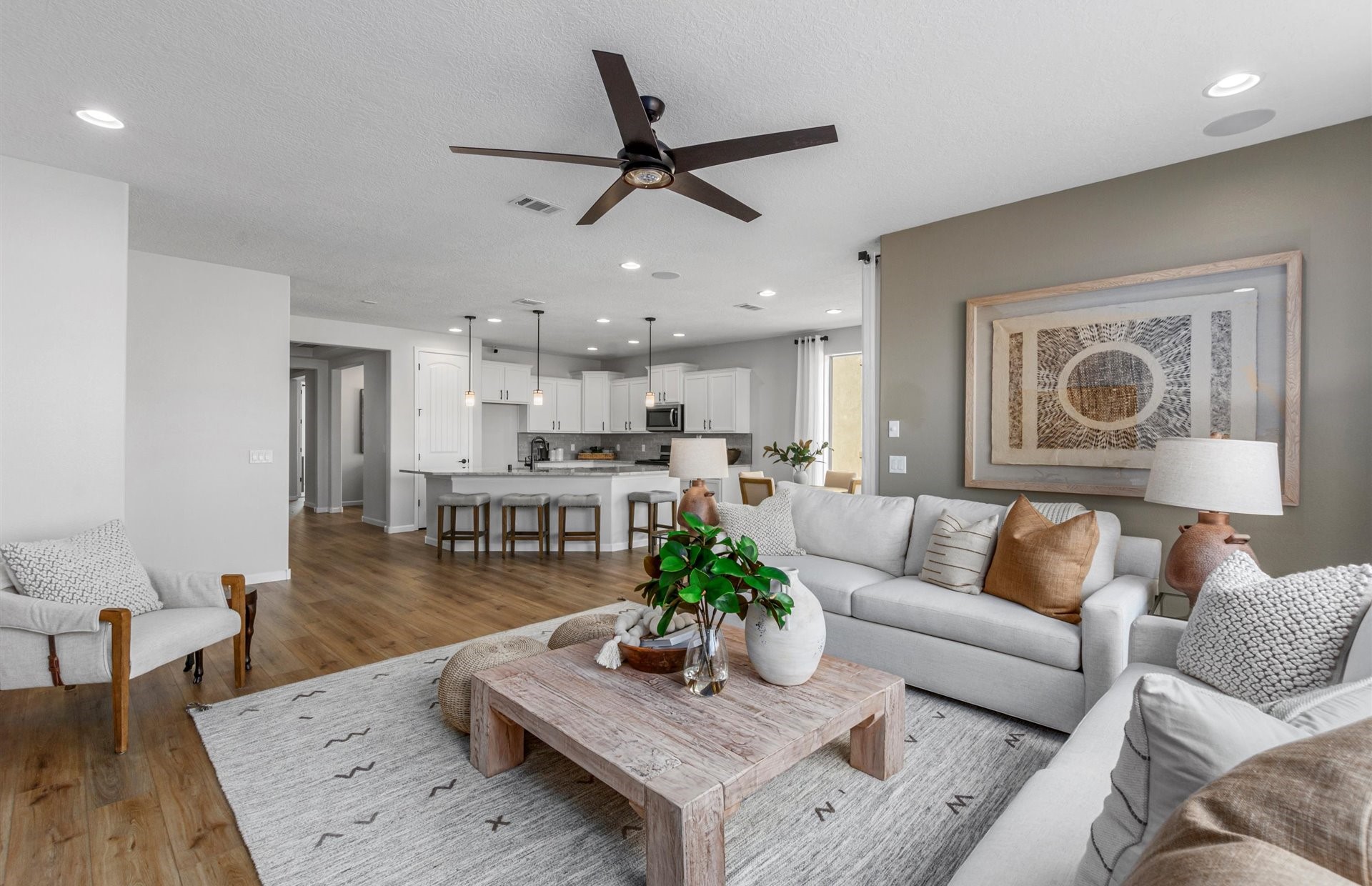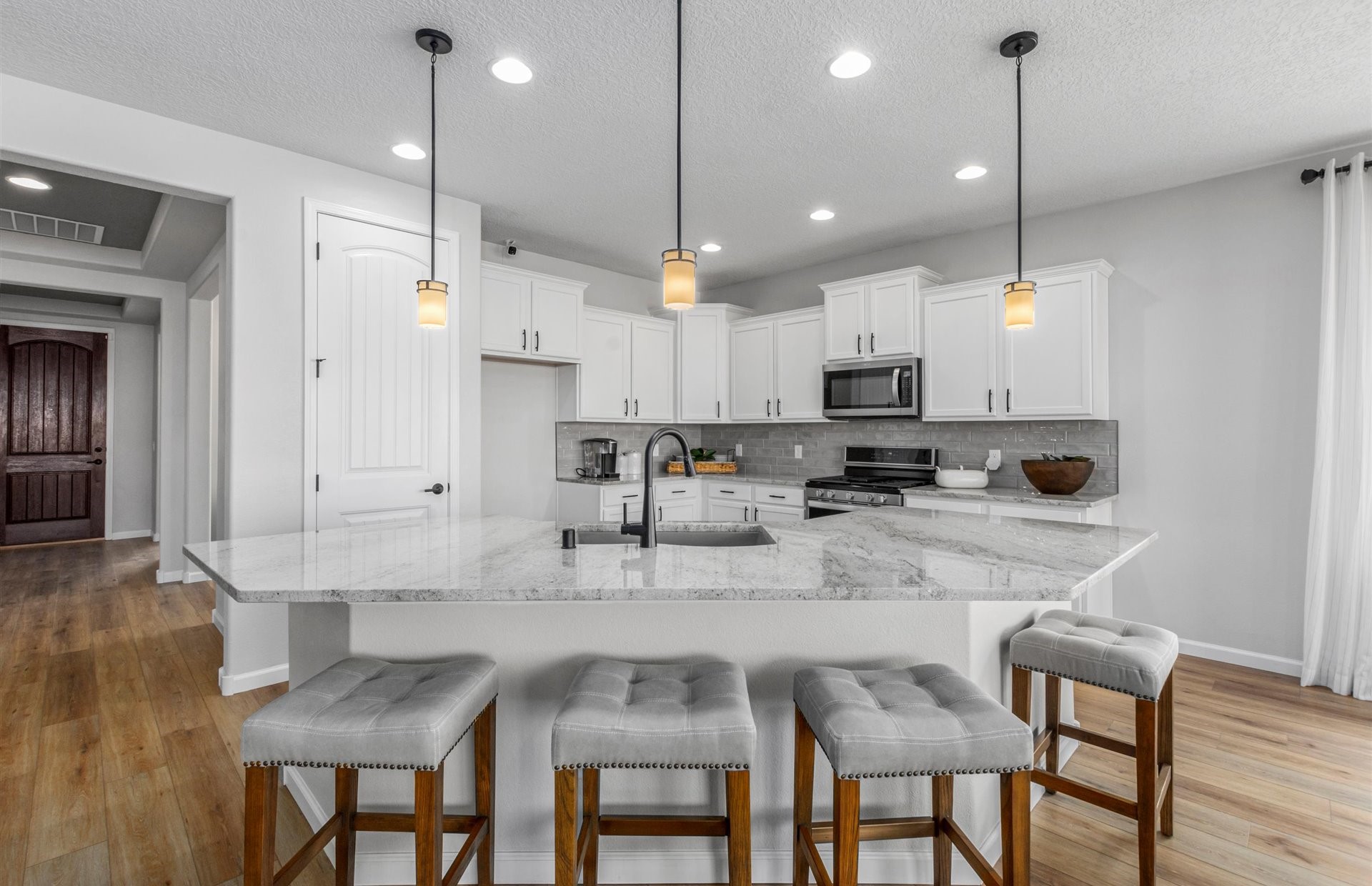 This cozy ranch-style home offers a perfect blend of comfort and elegance. The open-concept kitchen features a large island, upgraded 42" cabinets, and gorgeous granite countertops, making it an entertainer's dream. Natural light floods the space through ample windows, enhancing the airy and inviting atmosphere. Enjoy peaceful mornings or relaxing evenings on the spacious covered porch. The thoughtfully designed split floor plan ensures privacy and comfort, while 2-toned interior paint and upgraded flooring add a touch of sophistication throughout. The front courtyard is included! Located in the new Pulte Esencia Master Planned Community!