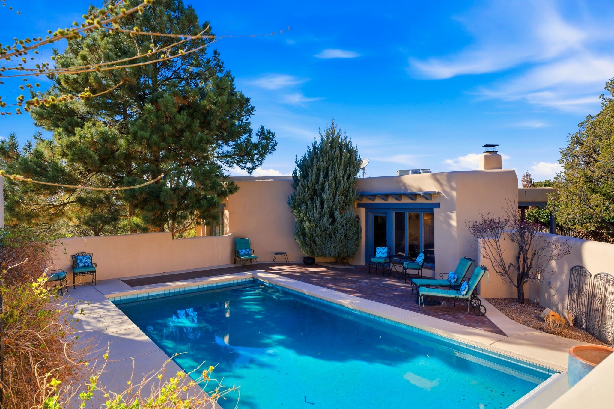 Set on approximately 2 private acres in one of Santa Fe's most coveted foothill enclaves, just a few quick minutes from Museum Hill and the Eastside, this exceptional compound unfolds as a beautifully composed private retreat defined by space, light, and remarkable natural surroundings. The property encompasses apx 3,610 sqft with a 3 BR / 4 BA configuration. The main residence spans roughly 3,040 sqft with 2 BR / 3 BA filled with natural light from skylights and expansive windows that frame Santa Fe's legendary deep blue skies, brilliant pink sunsets, and luminous night skies. Authentic Santa Fe elements are abundant throughout, including vigas, latillas, nichos, and 3 kiva fireplaces. Luxurious wood, brick, and tile flooring and a streamlined elegant chef's kitchen with stainless appliances anchor the home's inviting living spaces. Historic elements from its original 1947 construction lend character and warmth throughout, though recently and thoroughly updated and completely renovated and modernized. A separate guest house of approximately 570 sqft completely reimagined offers a beautifully stunning and private 1 BR / 1 BA retreat. Distinctive Moroccan-imported doors and hardware open to interiors highlighted by striking oversized invisible pocket doors and diagonal blonde wood floors with a steam shower, creating an inviting and stylish sanctuary for guests, creative pursuits, or quiet retreat. Air-conditioning cools in the height of summer's hottest days. At the center of its outdoor experience is a newly redone walled and private saltwater lap pool with an automatic retractable cover - an elegant retreat for quiet morning swims, sun-drenched afternoons, or moonlit evenings. Surrounding the pool are rare, lush grass lawns - an extraordinary luxury in Santa Fe - along with generous outdoor spaces and private patios designed for spontaneous entertaining and languid moments. This gated paradise provides exceptional privacy and abundant parking with direct, close access from the property to the Sun Mountain trail system - offering the rare privilege of stepping right from your backyard into one of Santa Fe's most beloved hiking landscapes. Here, expansive skies, breathtaking sunsets, and a deep sense of privacy create a lifestyle that is both rare and deeply restorative, Santa Fe itself truly embodied in an exceptional estate.