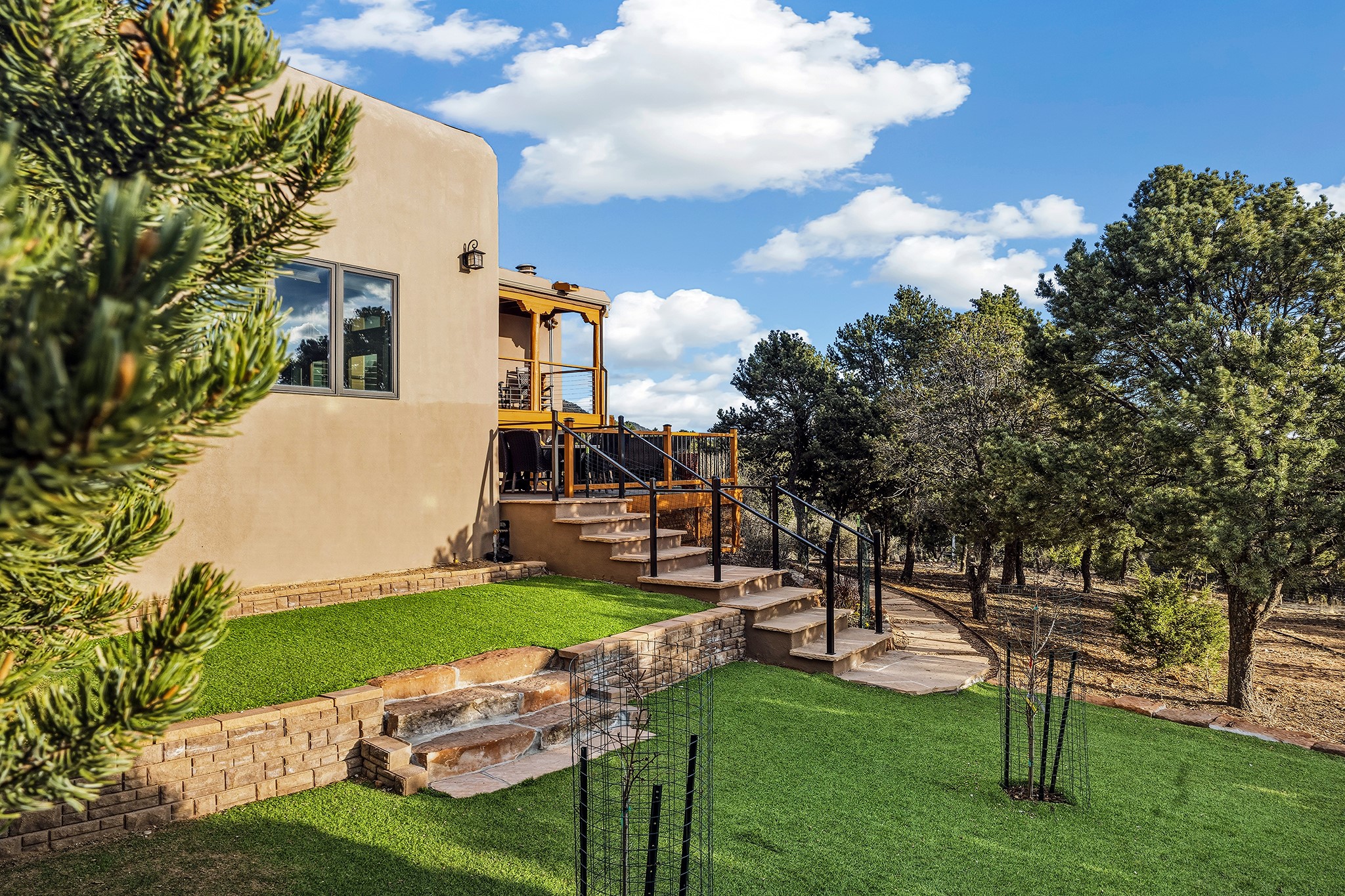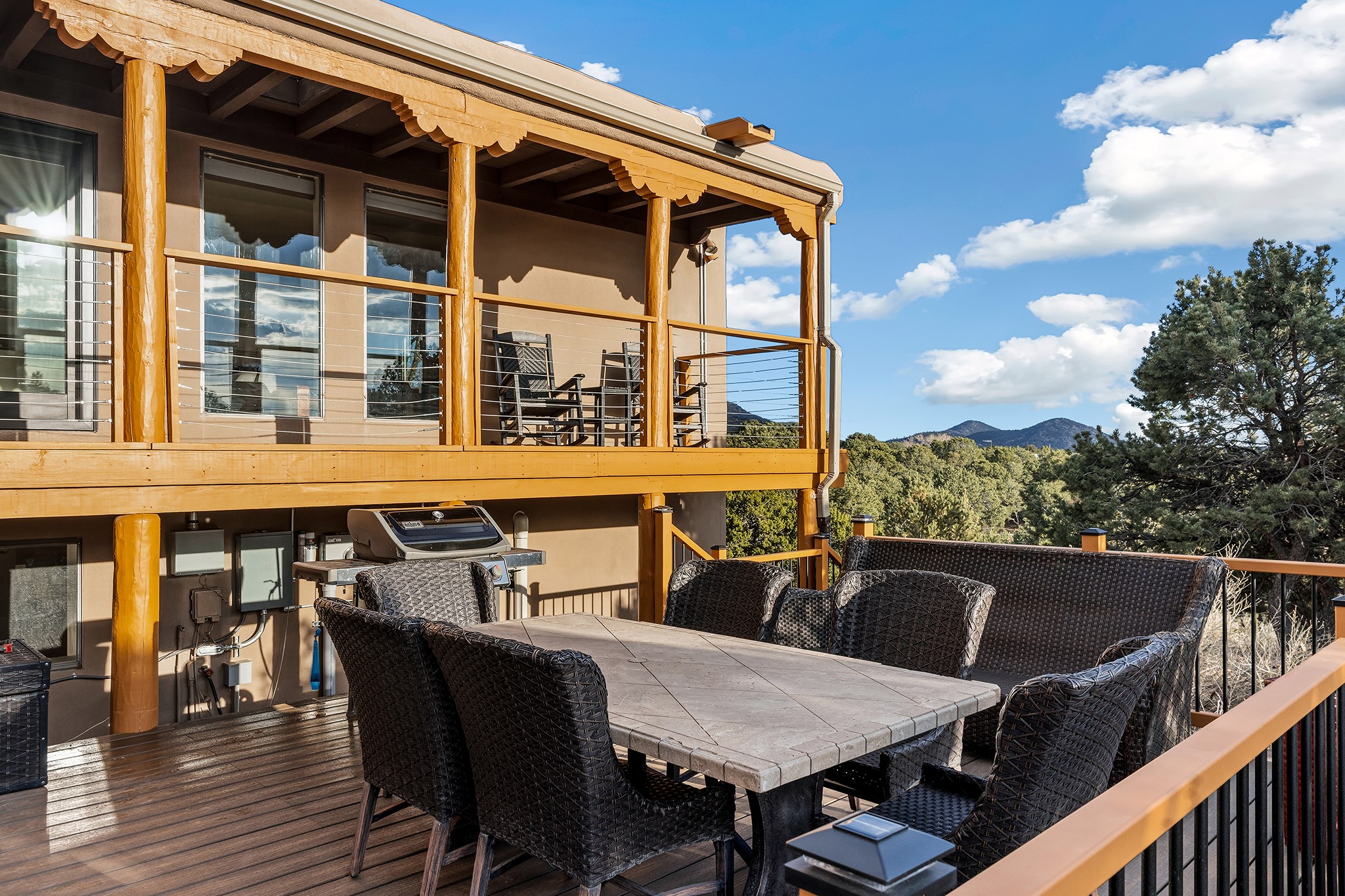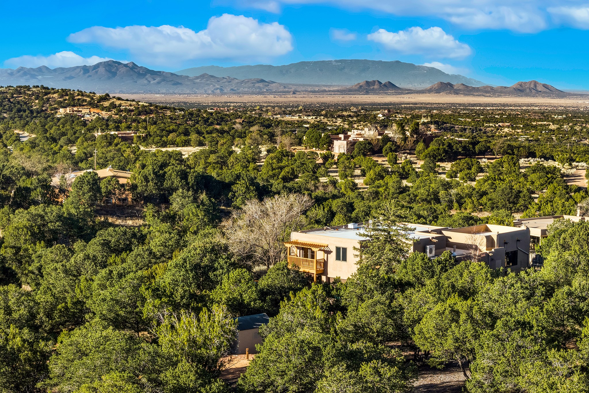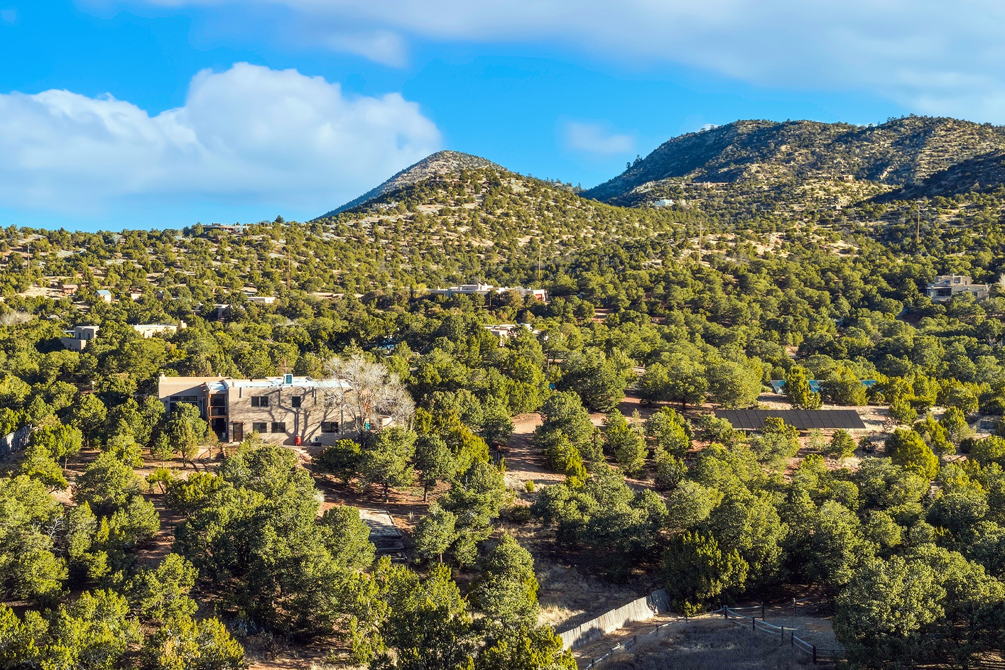 Located in the coveted gated community of Las Vistas and just minutes from the Plaza and downtown, this beautifully renovated 2,905 sq. ft. home offers 4 bedrooms, 3 baths, and an office/den on 2 acres at the end of a quiet cul-de-sac. The property enjoys wonderful views of the Sandia and Jemez Mountains.The open-concept kitchen, living, and dining areas feature new wood flooring, viga ceilings, and a thoughtfully designed chef's kitchen with generous counter space and a bar for casual dining. French doors from the living room open onto a Trex deck ideal for outdoor dining and relaxing while overlooking the fenced acreage, complete with walking paths and peaceful sitting areas.For four-legged family members, the owners have installed a buried electric fence around the perimeter of the property.The upper level hosts the primary suite and two generous guest bedrooms. The primary suite enjoys access to a long balcony perfect for sunset views and stargazing. The two guest bedrooms--one currently used as a gym--share a beautifully renovated bathroom.The lower level connects to the oversized two-car garage and includes a remodeled laundry room with storage, a half bath, and a renovated fourth bedroom with a three-quarter bath and direct access to the yard.Recent upgrades include a new solar array, complete electrical upgrade, mini-split systems, new flooring, a newly rebuilt deck, seven new windows, and a new tankless water heater. The HOA dues of $1,200/year cover water (award-winning community water), road maintenance and gate maintenance. Fiber optic was buried in Las Vistas 5 years ago and the internet is speed is exceptional. With its prime Las Vistas location, extensive renovations, and proximity to downtown Santa Fe, this move-in-ready property offers an exceptional opportunity to immediately enjoy the Santa Fe lifestyle. Located within the Wood Gormley Elementary School District.