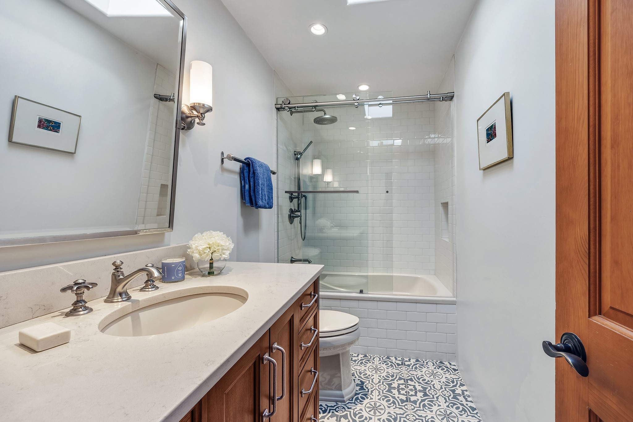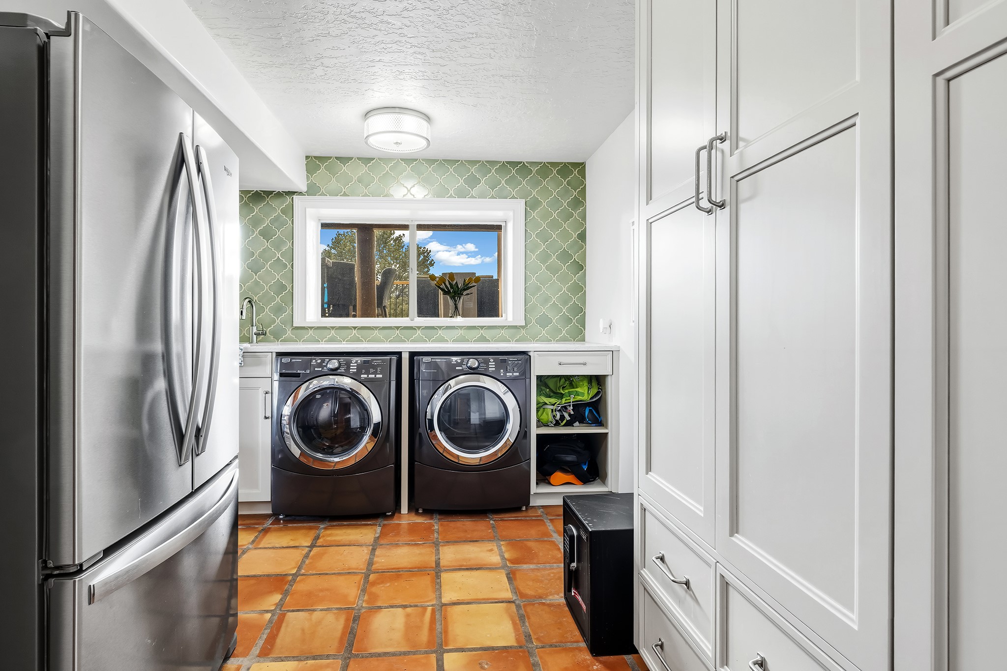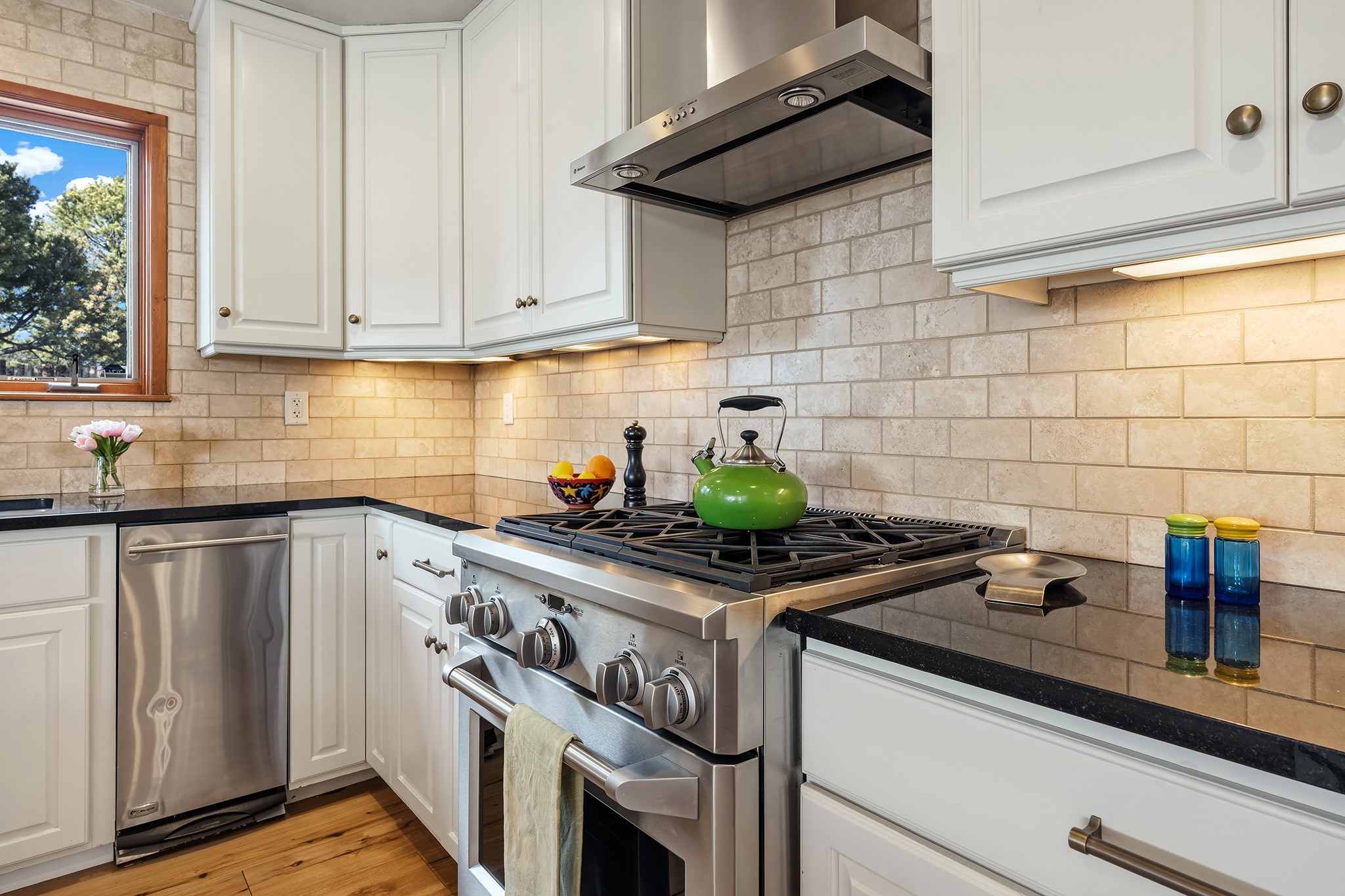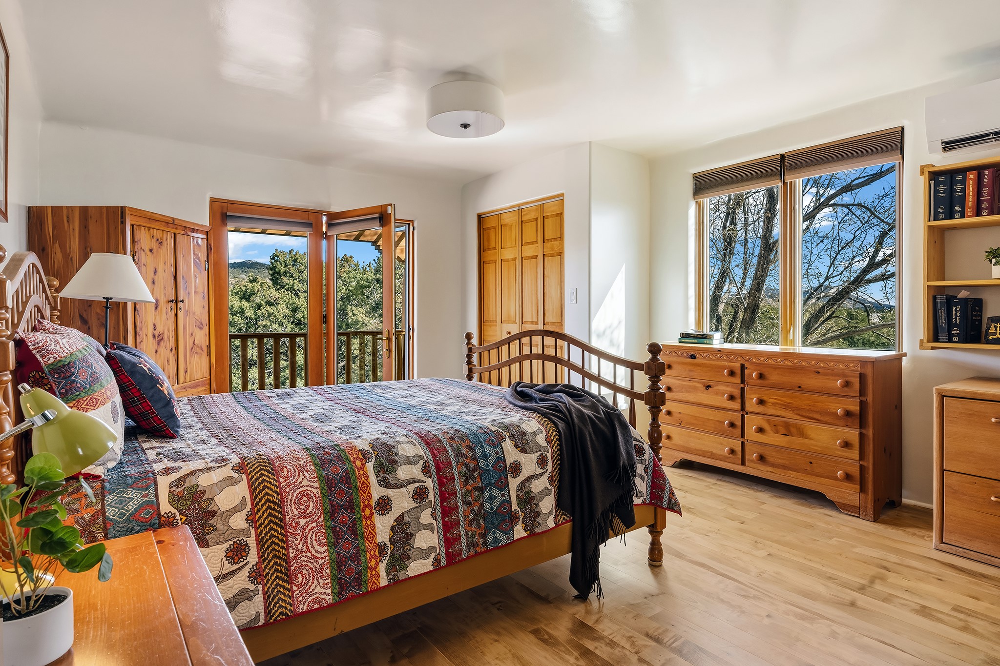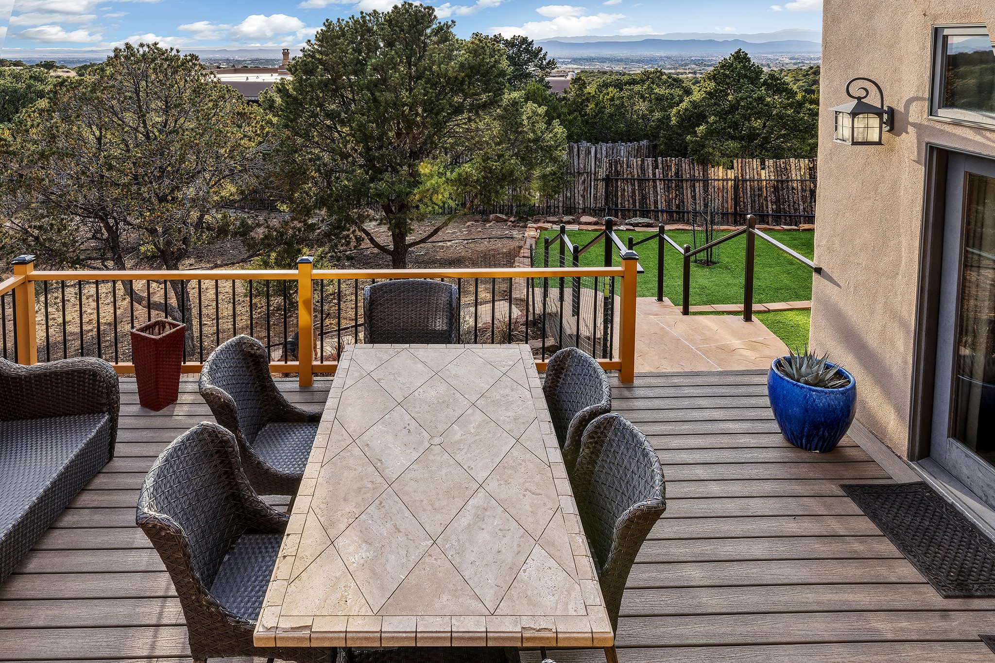 Located in the coveted gated community of Las Vistas and just minutes from the Plaza and downtown, this beautifully renovated 2,905 sq. ft. home offers 4 bedrooms, 3 baths, and an office/den on 2 acres at the end of a quiet cul-de-sac. The property enjoys wonderful views of the Sandia and Jemez Mountains.The open-concept kitchen, living, and dining areas feature new wood flooring, viga ceilings, and a thoughtfully designed chef's kitchen with generous counter space and a bar for casual dining. French doors from the living room open onto a Trex deck ideal for outdoor dining and relaxing while overlooking the fenced acreage, complete with walking paths and peaceful sitting areas.For four-legged family members, the owners have installed a buried electric fence around the perimeter of the property.The upper level hosts the primary suite and two generous guest bedrooms. The primary suite enjoys access to a long balcony perfect for sunset views and stargazing. The two guest bedrooms--one currently used as a gym--share a beautifully renovated bathroom.The lower level connects to the oversized two-car garage and includes a remodeled laundry room with storage, a half bath, and a renovated fourth bedroom with a three-quarter bath and direct access to the yard.Recent upgrades include a new solar array, complete electrical upgrade, mini-split systems, new flooring, a newly rebuilt deck, seven new windows, and a new tankless water heater. The HOA dues of $1,200/year cover water (award-winning community water), road maintenance and gate maintenance. Fiber optic was buried in Las Vistas 5 years ago and the internet is speed is exceptional. With its prime Las Vistas location, extensive renovations, and proximity to downtown Santa Fe, this move-in-ready property offers an exceptional opportunity to immediately enjoy the Santa Fe lifestyle. Located within the Wood Gormley Elementary School District.