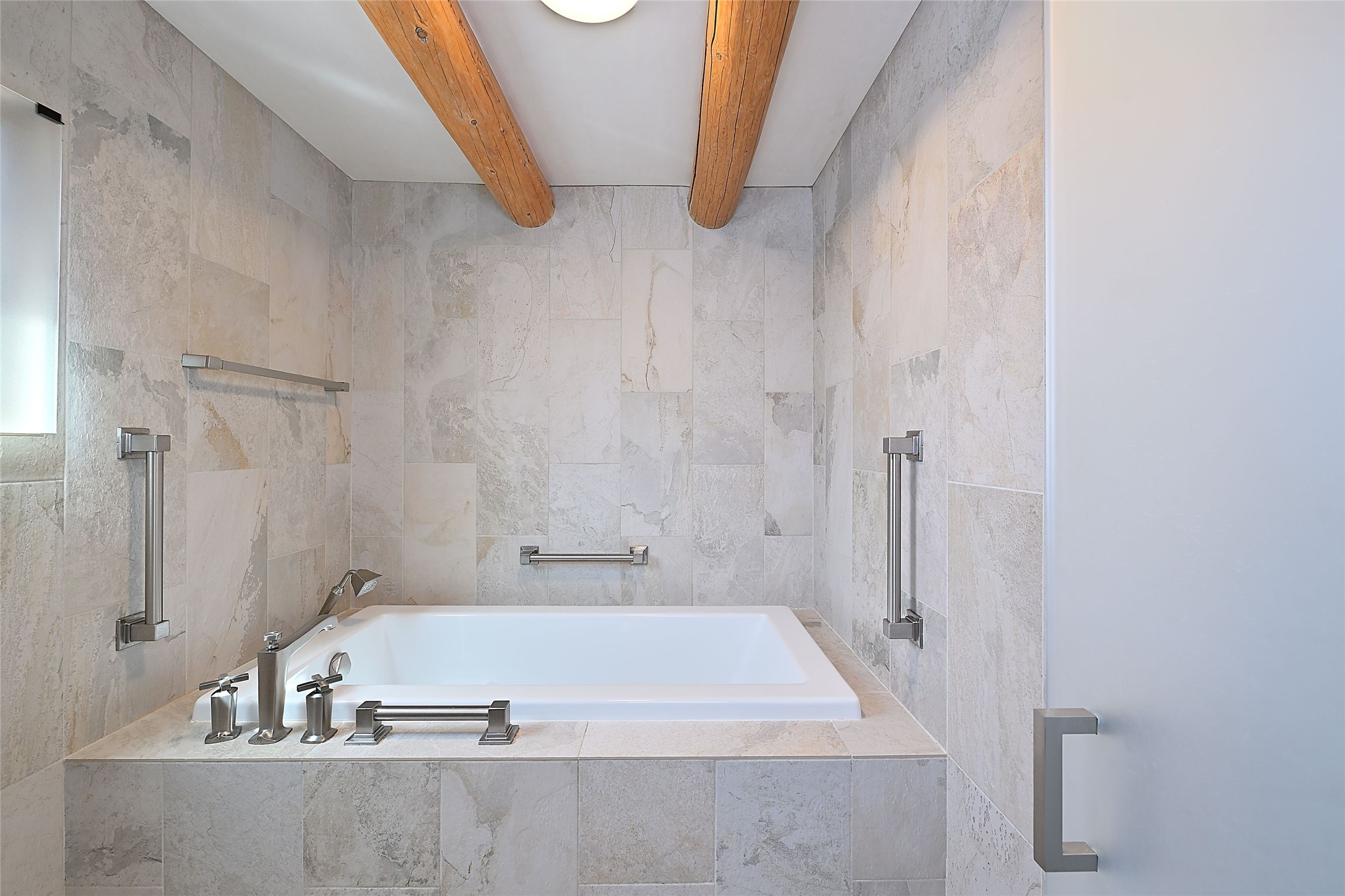 One of only two homes on a quiet cul-de-sac off an iconic winding Eastside lane, this hilltop hideaway enjoys an enviable private perch with a view of historic rooftops, mountains and foothills, and clear blue skies. The property's gated drive ascends to a spacious parking area that accompanies a three-bedroom home with a carport and an idyllic courtyard, a generous guest casita, and a versatile light-filled studio. The main residence marries stylish living, dining, and entertaining spaces with a cook's kitchen, a rare greenhouse or solarium, a main-level guest bedroom and bath, an upper-floor guest bedroom with a balcony, and an owner's suite that includes a sitting room or library with a foothills-facing balcony and a spa-inspired bath with a "wet room" tub and shower. Ceiling beams and vigas, colorful tilework, kiva fireplaces, numerous skylights and French doors, and warm earthy hues contribute to the sophisticated Southwestern ambience. The landscaped courtyard features a flagstone terrace, a portal, and a picturesque view. The separate studio will delight artists but can also serve as a workshop, fitness, or meditation space. Short- or long-term guests will appreciate the lofty bedroom and living space of the casita, which also offers a well-outfitted kitchen, a fashionable bath, and a laundry area. The coveted location is walking distance from the Plaza, Canyon Road, and other attractions and amenities of downtown and the historic Eastside.