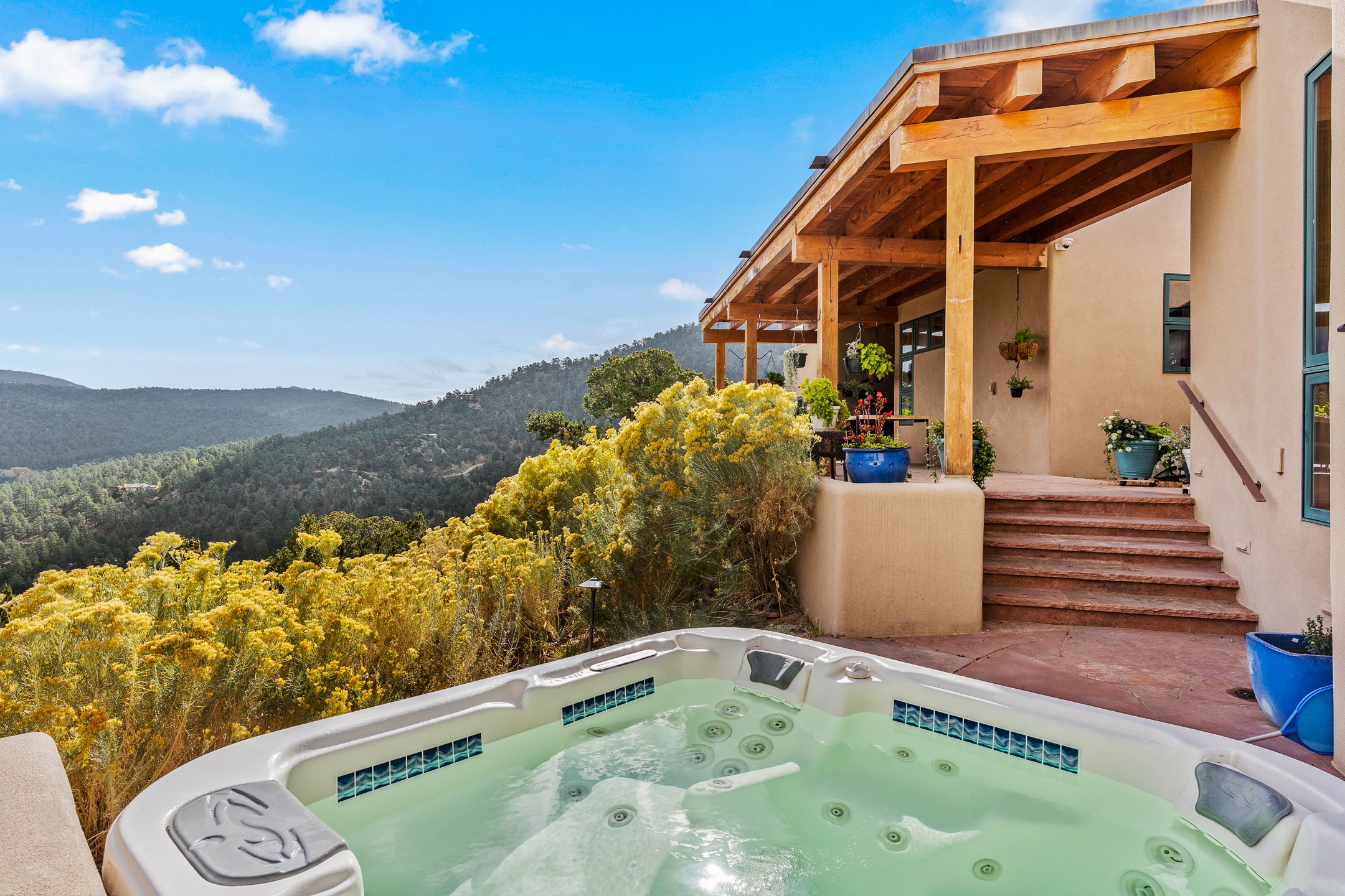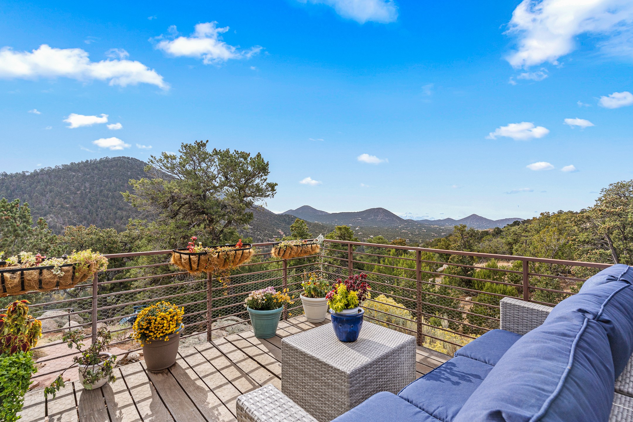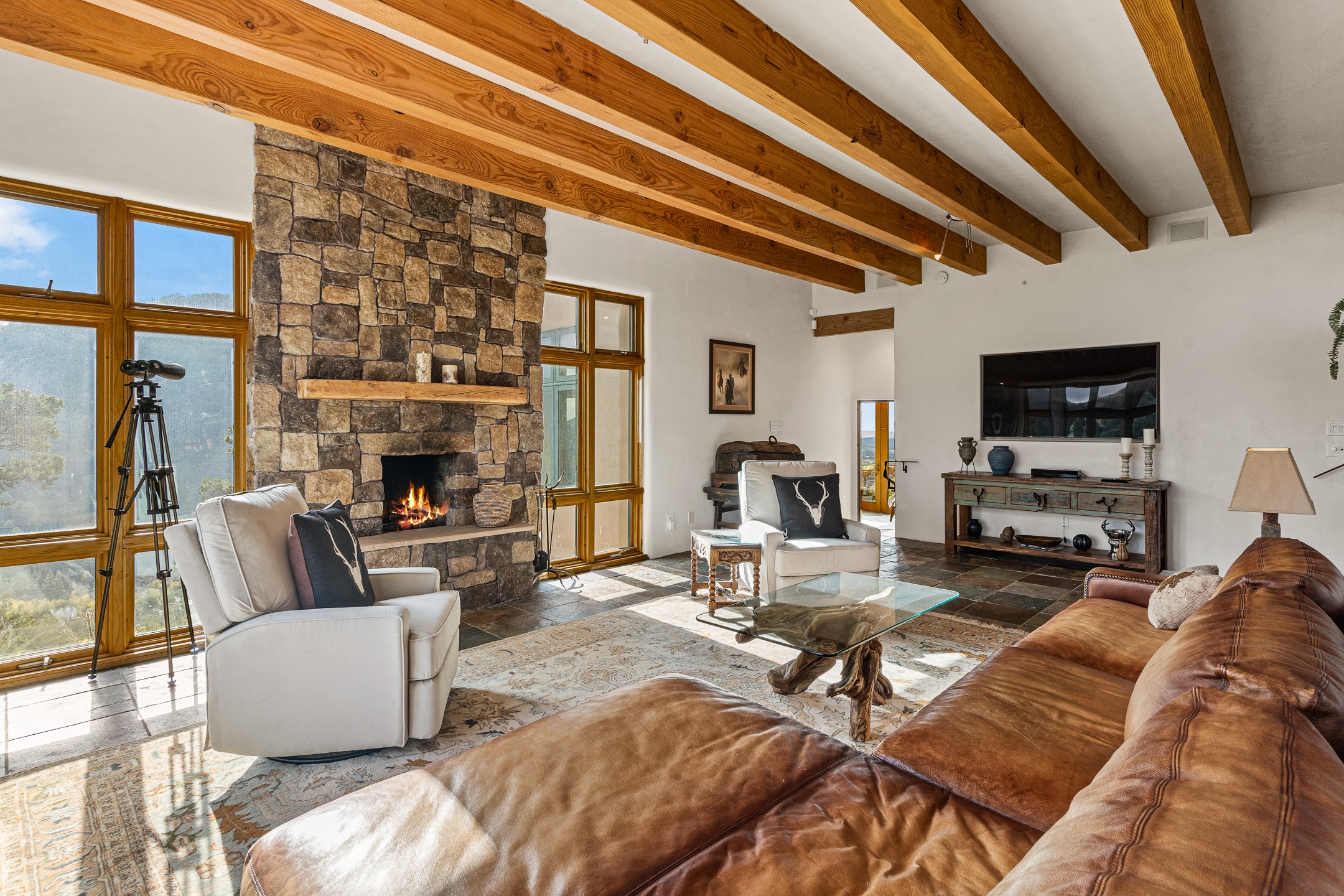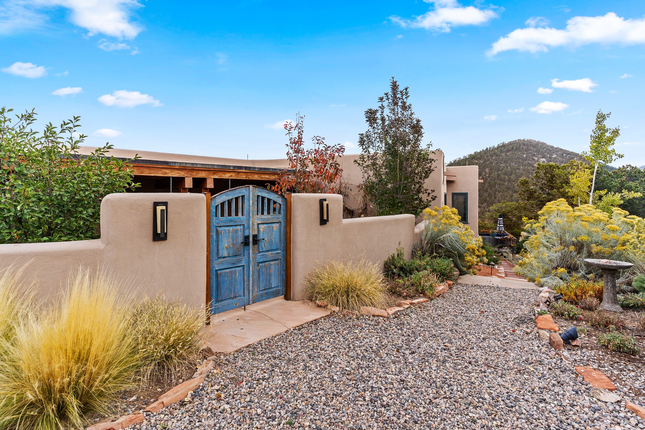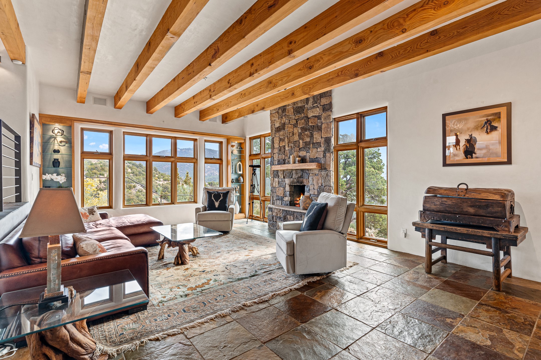 Perched over La Barbaria Canyon this mountain top, contemporary pueblo-styled, light filled 4-bedroom, 2-full and 2- () bath home dazzles with floor-to-ceiling windows, multiple skylights, stunning mountain views, and a mountainside viewing arena with a firepit and unobstructed views into La Barbaria Canyon and the Pecos Wilderness. Featuring 2 primary suites at opposite ends of the home, the open floor plan flows from the grand foyer into the luxurious Chef's kitchen to the dining area, 2 ensuite bedrooms and the sunken living room with stone fireplace. The kitchen features custom cherrywood cabinetry, wrap around counter with bar seating, Sub-Zero, Viking and Miele appliances and a wine cooler. Enjoy radiant heat throughout and 10' ceilings with gorgeous wooden beams in every room. All rooms feature stellar mountain views. One master suite, added in a renovation completed by Sharron Woods, includes a fireplace and a spacious, wheelchair accessible master bathroom with a free-standing tub and an oversized steam shower. The second master suite features a large tub with big mountain views, a large, open shower, and its own deck. Outdoor living is enhanced by a gated driveway with large parking area, a walled courtyard, portals and mountainside patios. Enjoy the moonrise from the east side hot tub. Additional features include an oversized 2-car garage and Culligan purified water system. This is luxurious Santa Fe living in an irreplicable mountaintop dreamscape.