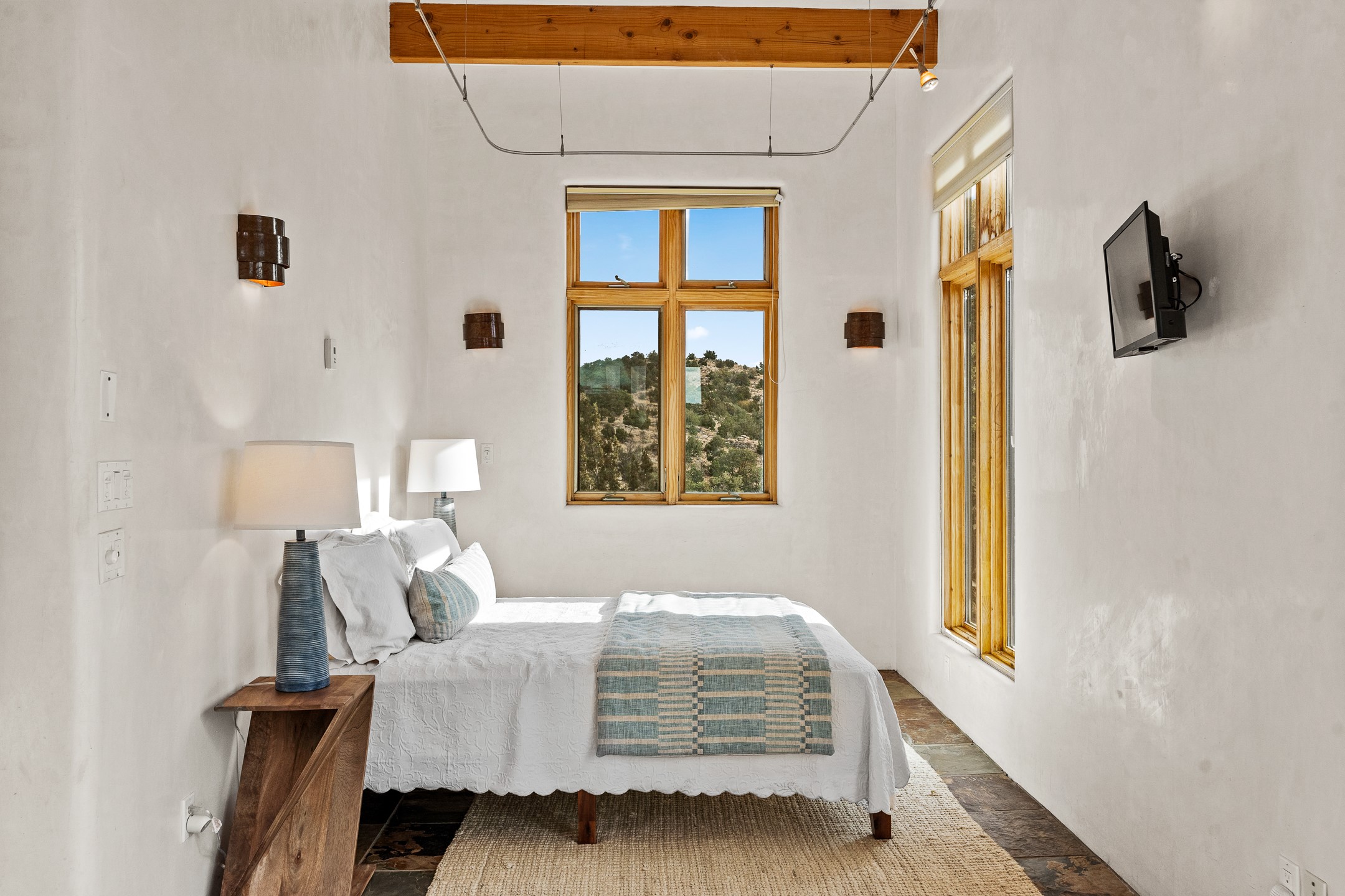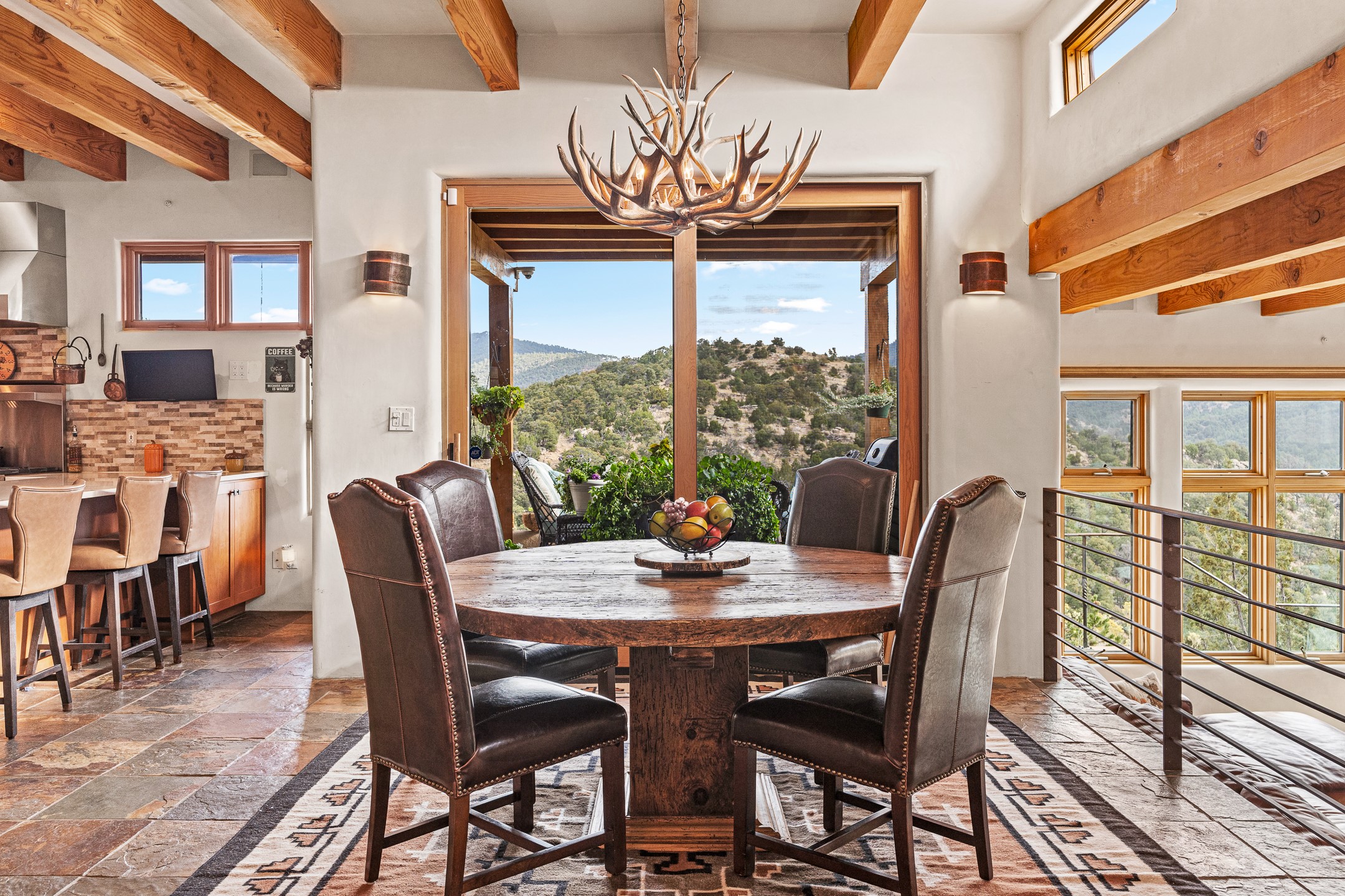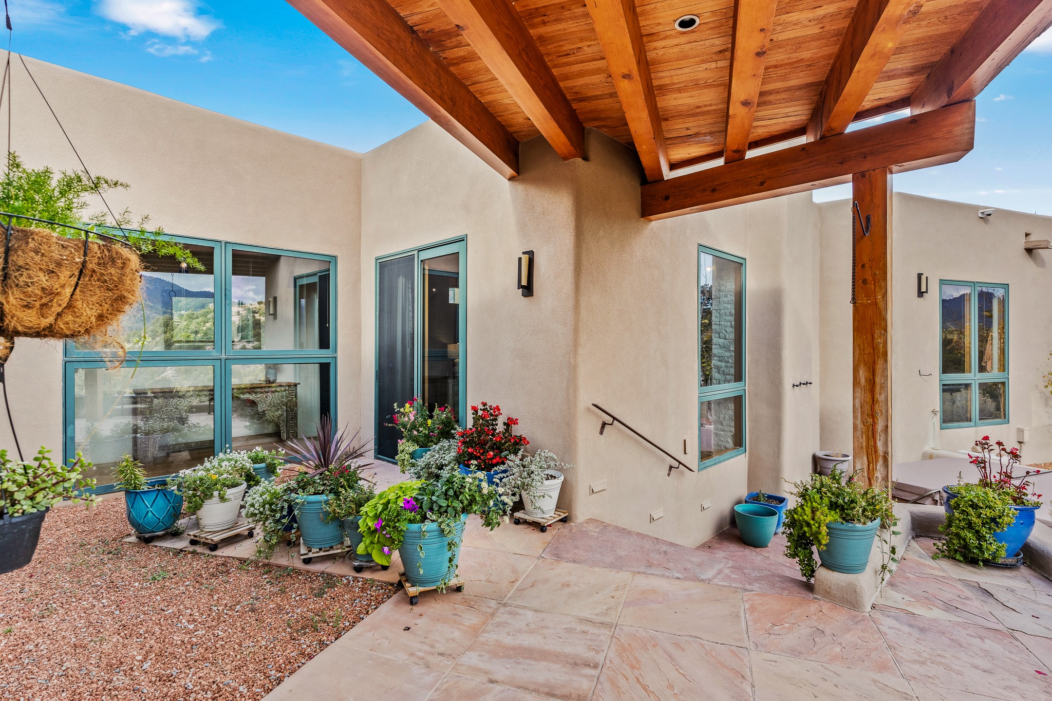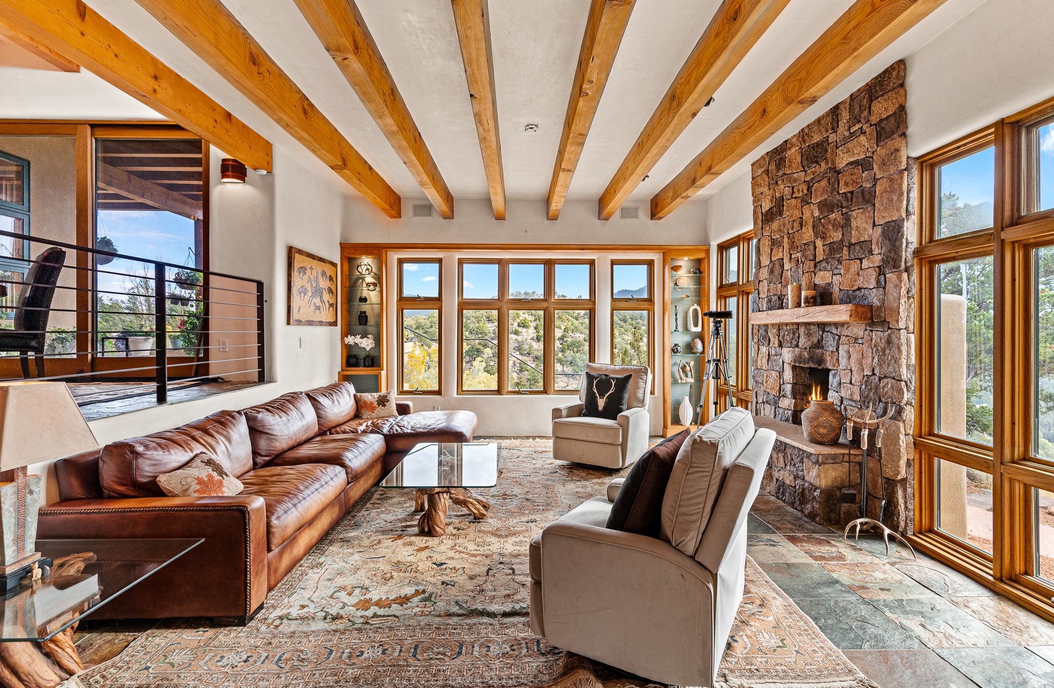 Perched over La Barbaria Canyon this mountain top, contemporary pueblo-styled, light filled 4-bedroom, 2-full and 2- () bath home dazzles with floor-to-ceiling windows, multiple skylights, stunning mountain views, and a mountainside viewing arena with a firepit and unobstructed views into La Barbaria Canyon and the Pecos Wilderness. Featuring 2 primary suites at opposite ends of the home, the open floor plan flows from the grand foyer into the luxurious Chef's kitchen to the dining area, 2 ensuite bedrooms and the sunken living room with stone fireplace. The kitchen features custom cherrywood cabinetry, wrap around counter with bar seating, Sub-Zero, Viking and Miele appliances and a wine cooler. Enjoy radiant heat throughout and 10' ceilings with gorgeous wooden beams in every room. All rooms feature stellar mountain views. One master suite, added in a renovation completed by Sharron Woods, includes a fireplace and a spacious, wheelchair accessible master bathroom with a free-standing tub and an oversized steam shower. The second master suite features a large tub with big mountain views, a large, open shower, and its own deck. Outdoor living is enhanced by a gated driveway with large parking area, a walled courtyard, portals and mountainside patios. Enjoy the moonrise from the east side hot tub. Additional features include an oversized 2-car garage and Culligan purified water system. This is luxurious Santa Fe living in an irreplicable mountaintop dreamscape.