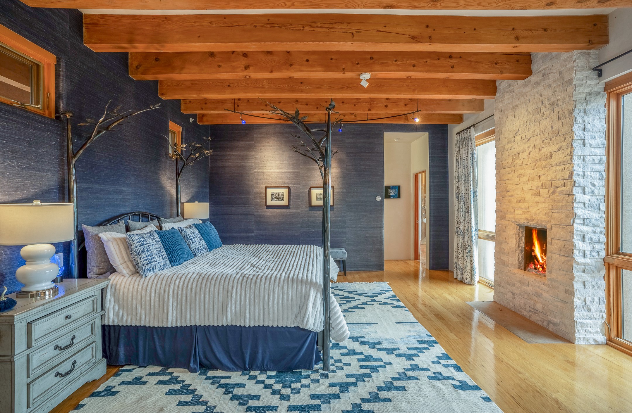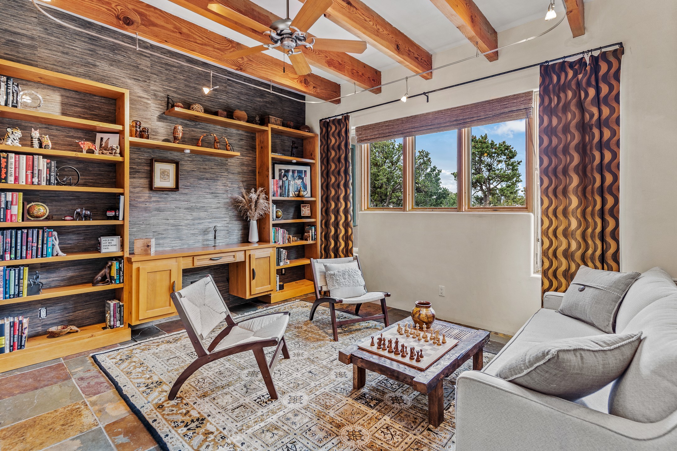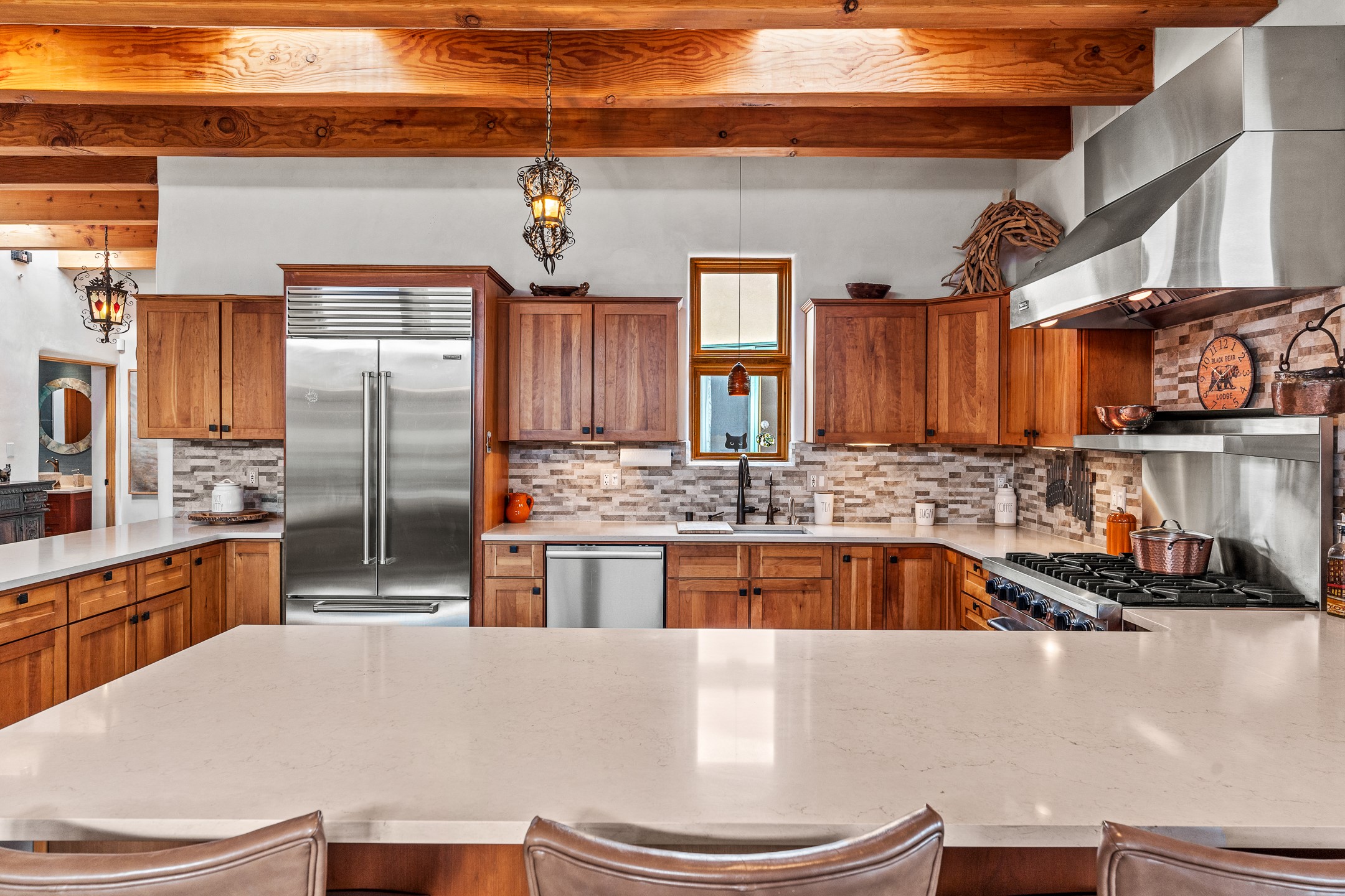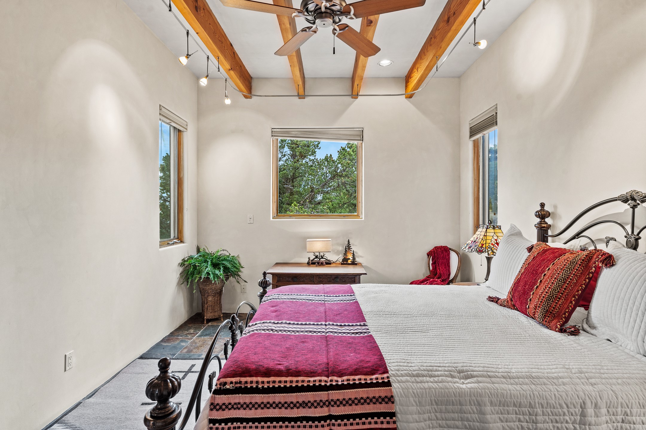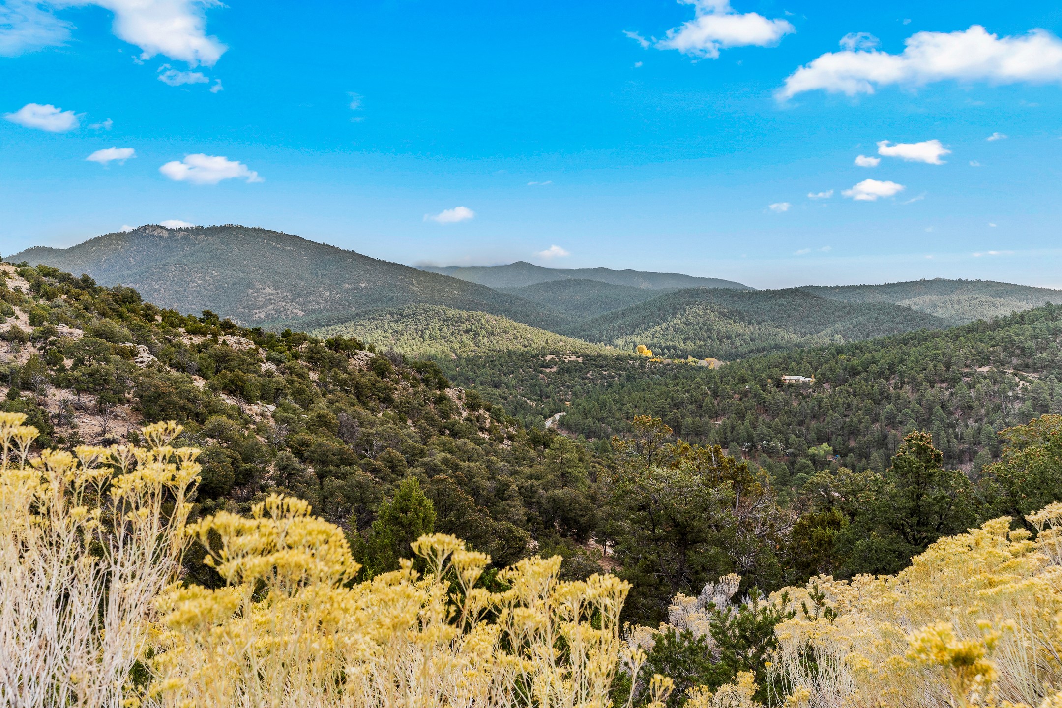 Perched over La Barbaria Canyon this mountain top, contemporary pueblo-styled, light filled 4-bedroom, 2-full and 2- () bath home dazzles with floor-to-ceiling windows, multiple skylights, stunning mountain views, and a mountainside viewing arena with a firepit and unobstructed views into La Barbaria Canyon and the Pecos Wilderness. Featuring 2 primary suites at opposite ends of the home, the open floor plan flows from the grand foyer into the luxurious Chef's kitchen to the dining area, 2 ensuite bedrooms and the sunken living room with stone fireplace. The kitchen features custom cherrywood cabinetry, wrap around counter with bar seating, Sub-Zero, Viking and Miele appliances and a wine cooler. Enjoy radiant heat throughout and 10' ceilings with gorgeous wooden beams in every room. All rooms feature stellar mountain views. One master suite, added in a renovation completed by Sharron Woods, includes a fireplace and a spacious, wheelchair accessible master bathroom with a free-standing tub and an oversized steam shower. The second master suite features a large tub with big mountain views, a large, open shower, and its own deck. Outdoor living is enhanced by a gated driveway with large parking area, a walled courtyard, portals and mountainside patios. Enjoy the moonrise from the east side hot tub. Additional features include an oversized 2-car garage and Culligan purified water system. This is luxurious Santa Fe living in an irreplicable mountaintop dreamscape.