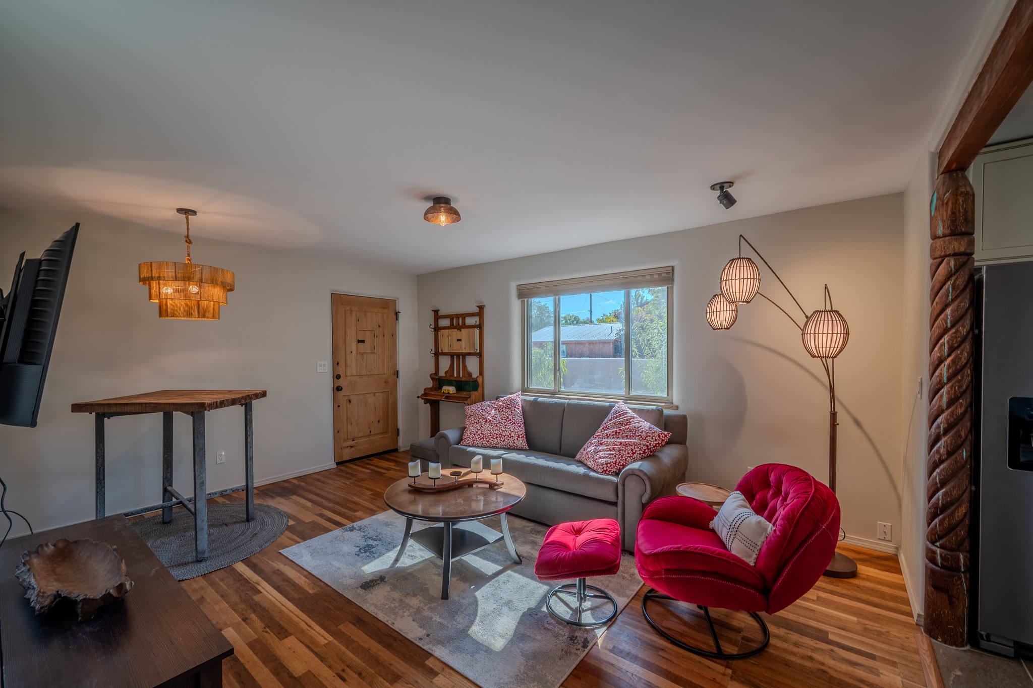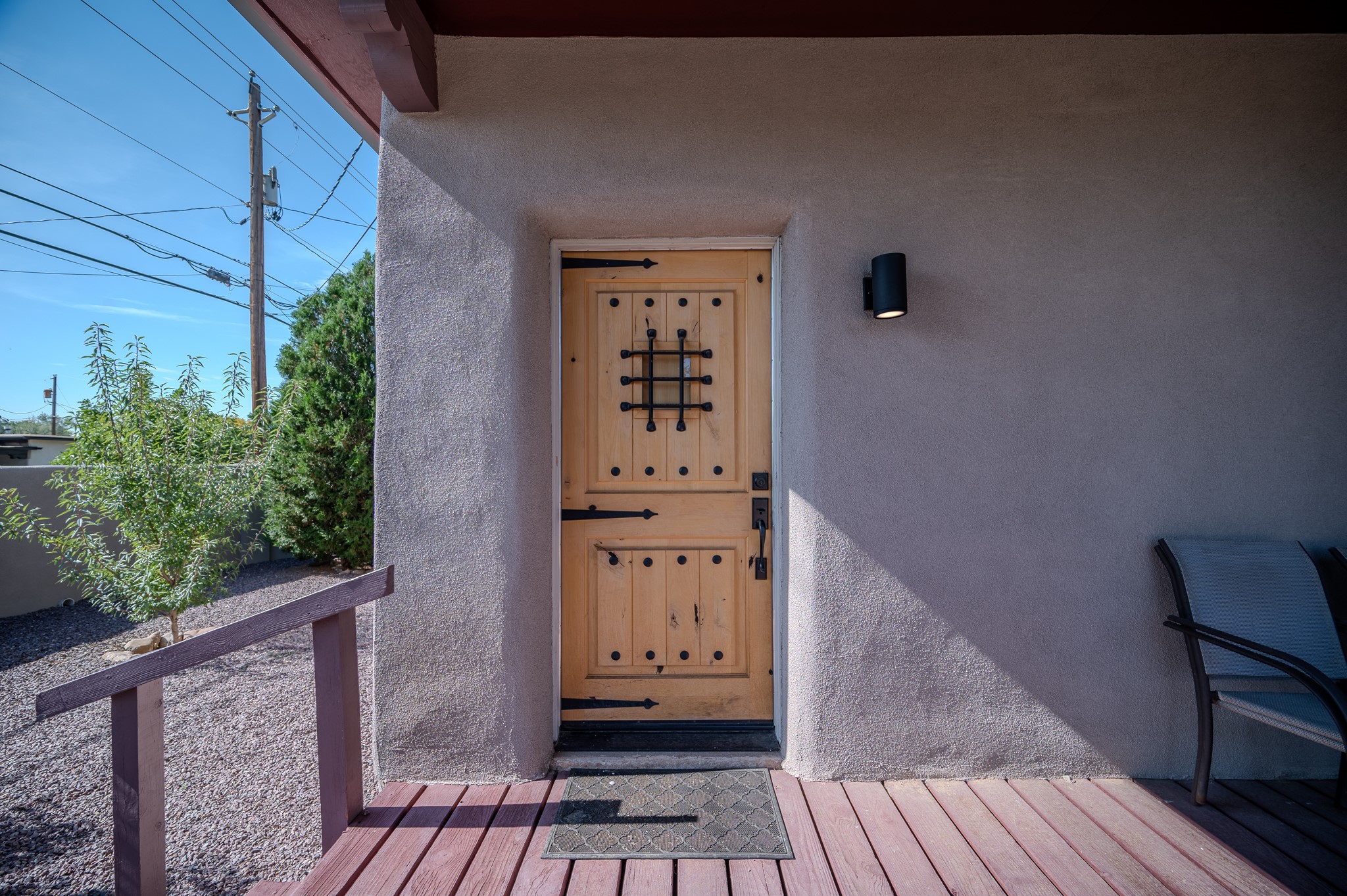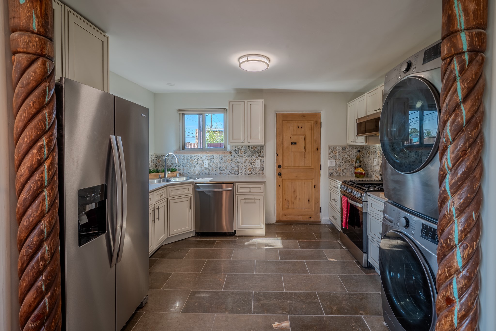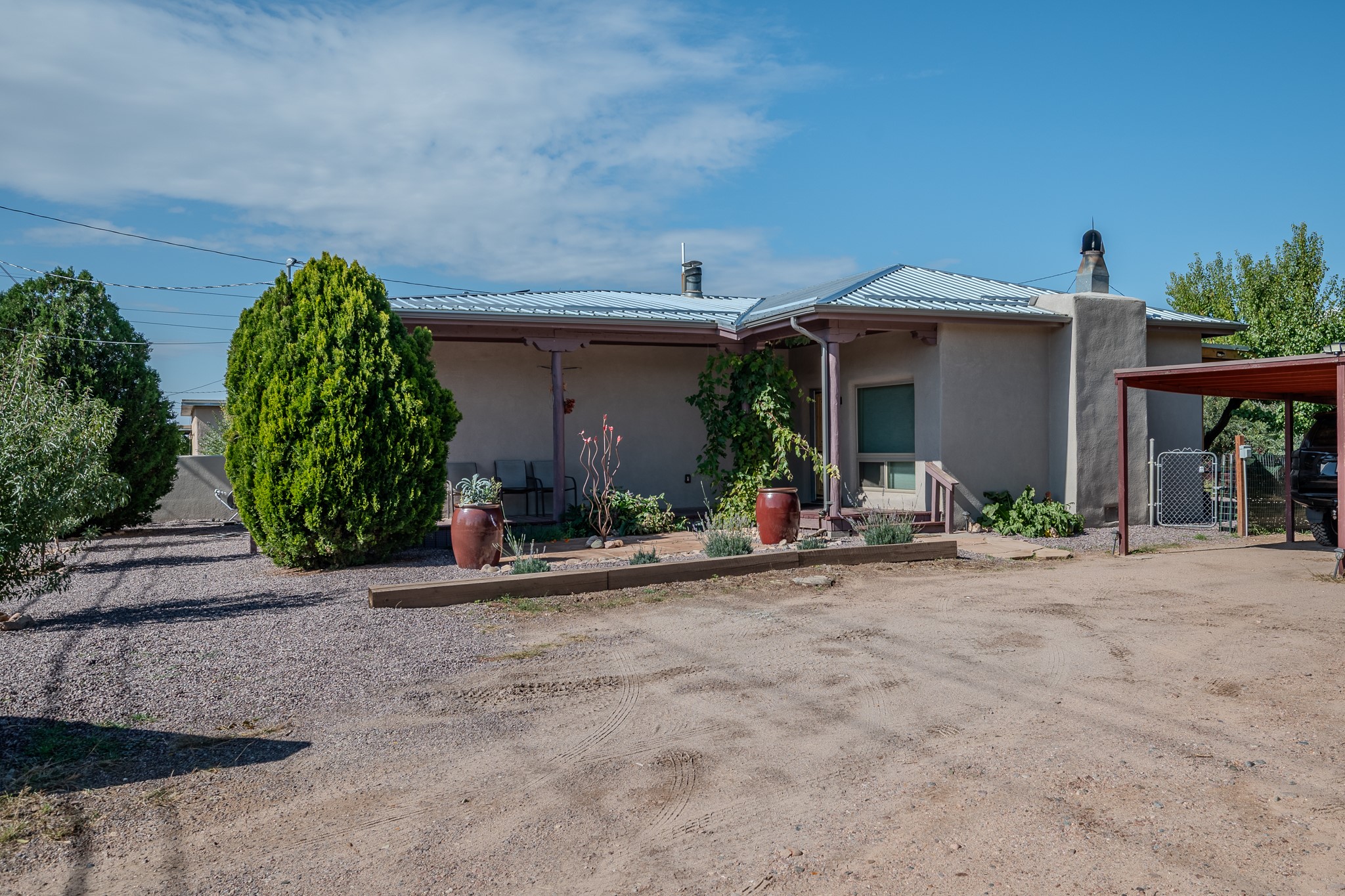 Remodeled with love and options. Single home, second home, duplex, multi generational easily done by opening/closing one interior door. Everything was completely updated 2023 including electric, plumbing, roof, stucco, windows, doors, insulation, 2 new fully equipped kitchens, baths, finishes and landscaping. The lot is large enough for adding a guest house or studio. Other features include privacy walls, abundant parking, edible landscaping like fruit and nut trees, storage, and a partial basement. There is a very good rental history as a furnished duplex. Furniture and amenities are included for a turnkey property. This location is ideal for walking and biking with near by parks, the Santa Fe River trail, restaurants and shops near by and .9 of a mile walk to the railyard for Farmers Market, restaurants, or the movies. Other businesses are within a couple blocks.