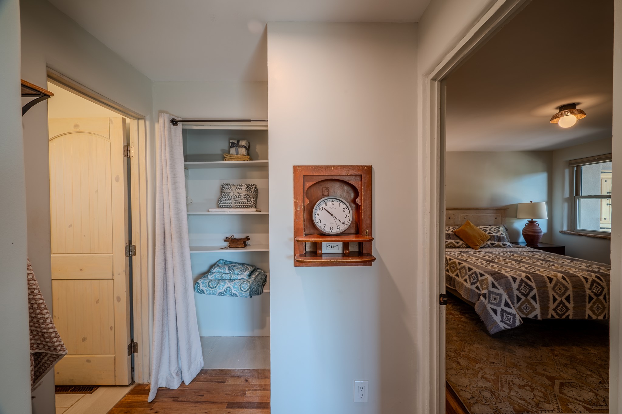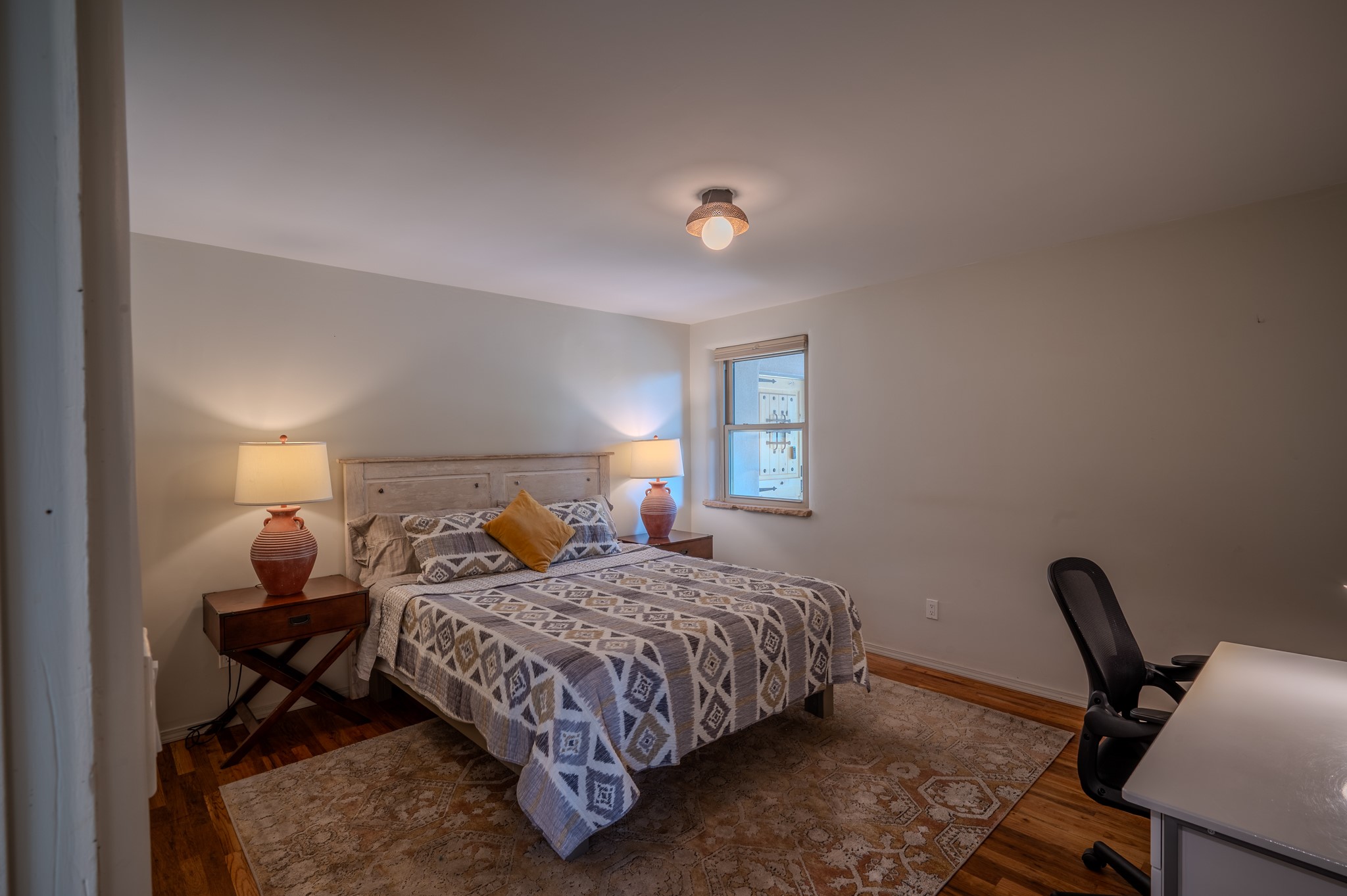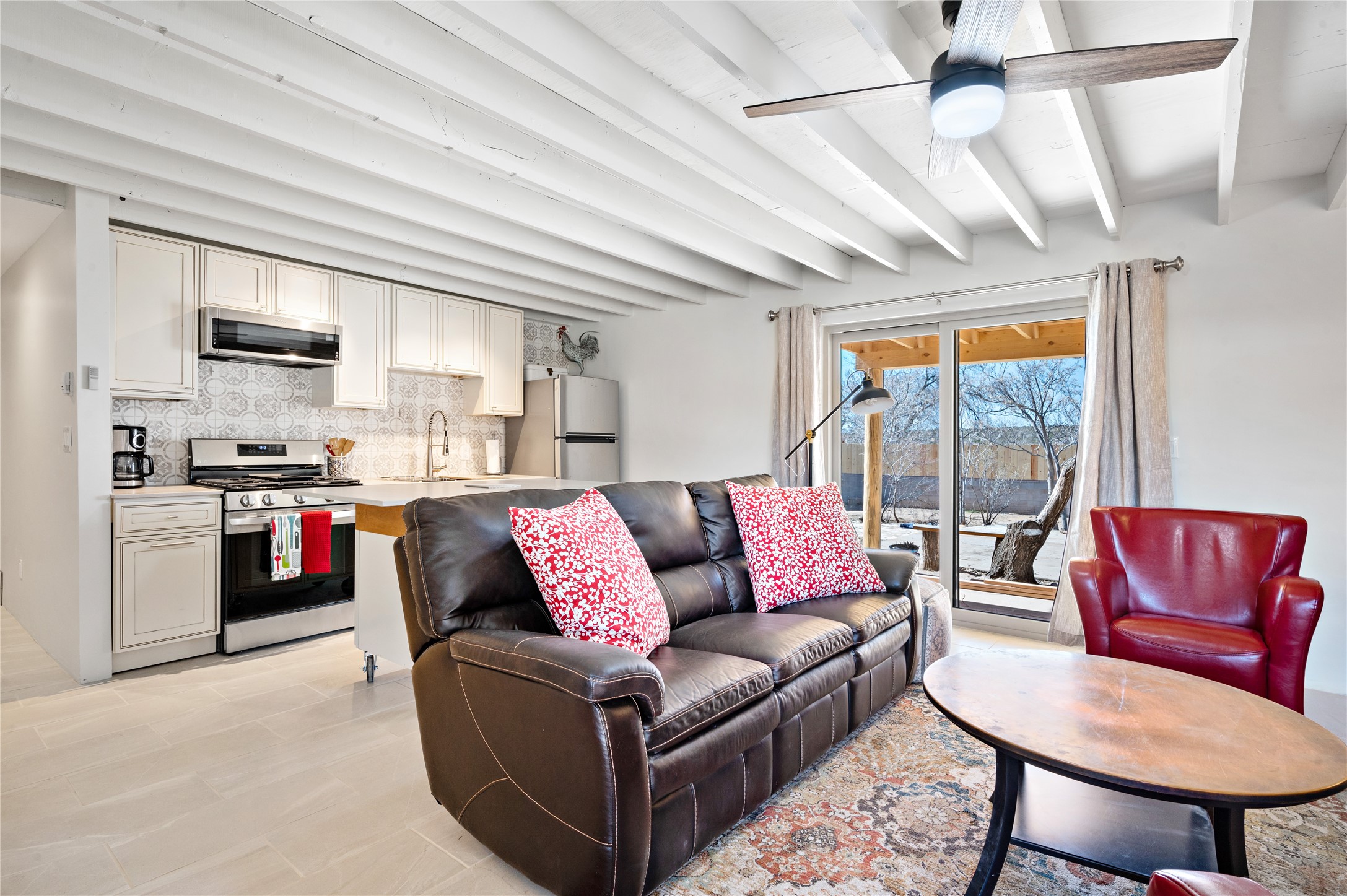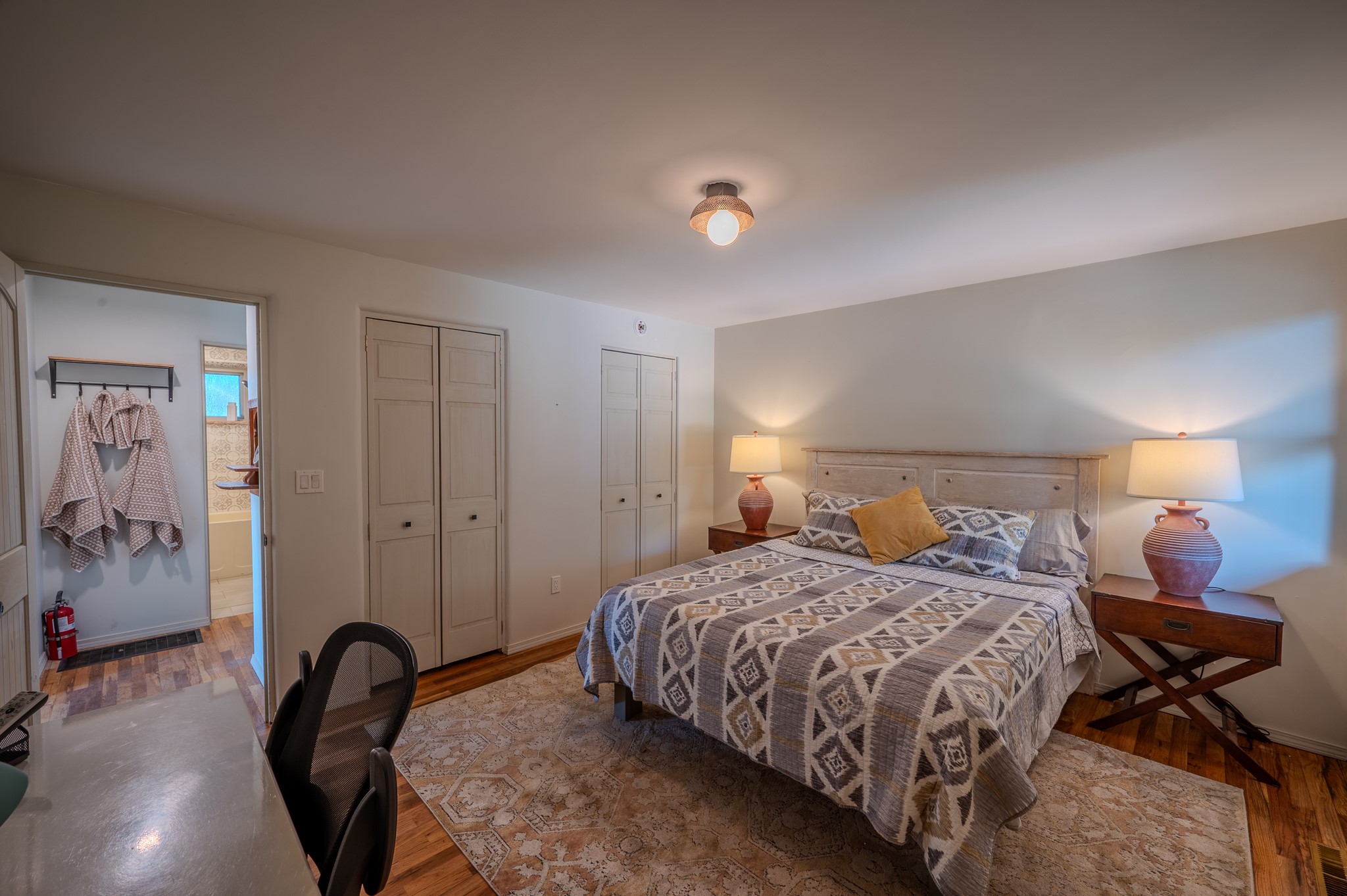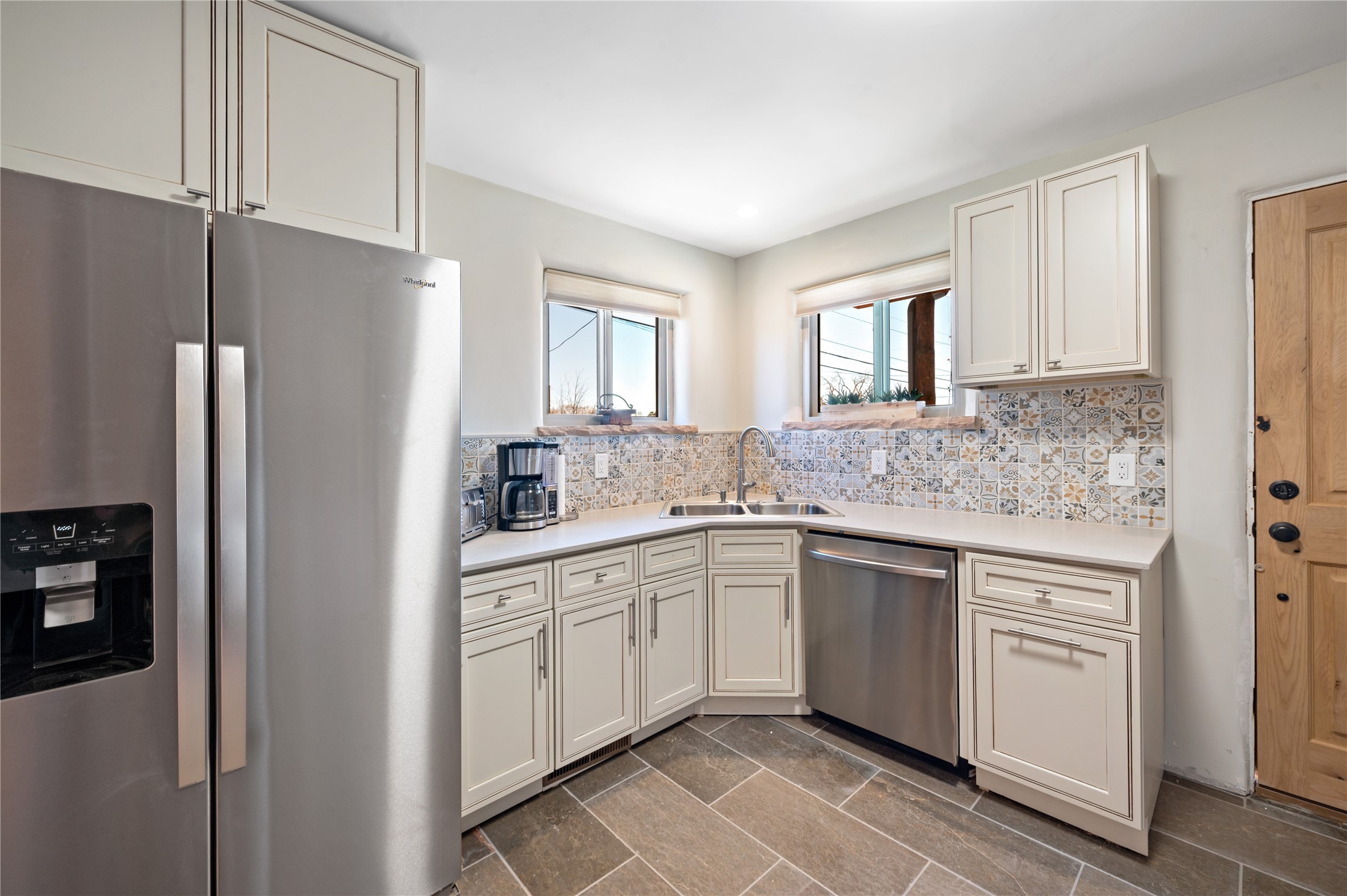 Remodeled with love and options. Single home, second home, duplex, multi generational easily done by opening/closing one interior door. Everything was completely updated 2023 including electric, plumbing, roof, stucco, windows, doors, insulation, 2 new fully equipped kitchens, baths, finishes and landscaping. The lot is large enough for adding a guest house or studio. Other features include privacy walls, abundant parking, edible landscaping like fruit and nut trees, storage, and a partial basement. There is a very good rental history as a furnished duplex. Furniture and amenities are included for a turnkey property. This location is ideal for walking and biking with near by parks, the Santa Fe River trail, restaurants and shops near by and .9 of a mile walk to the railyard for Farmers Market, restaurants, or the movies. Other businesses are within a couple blocks.