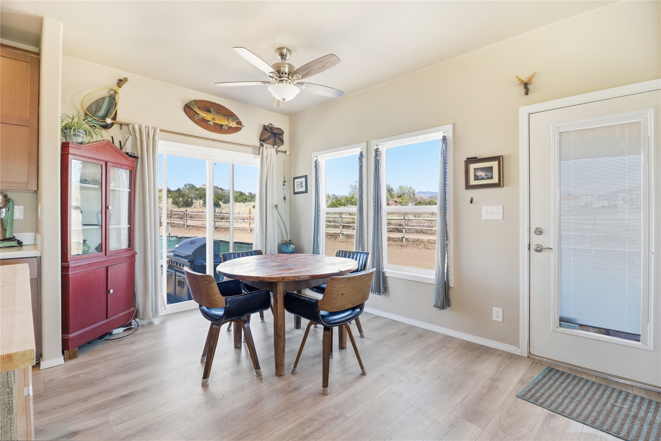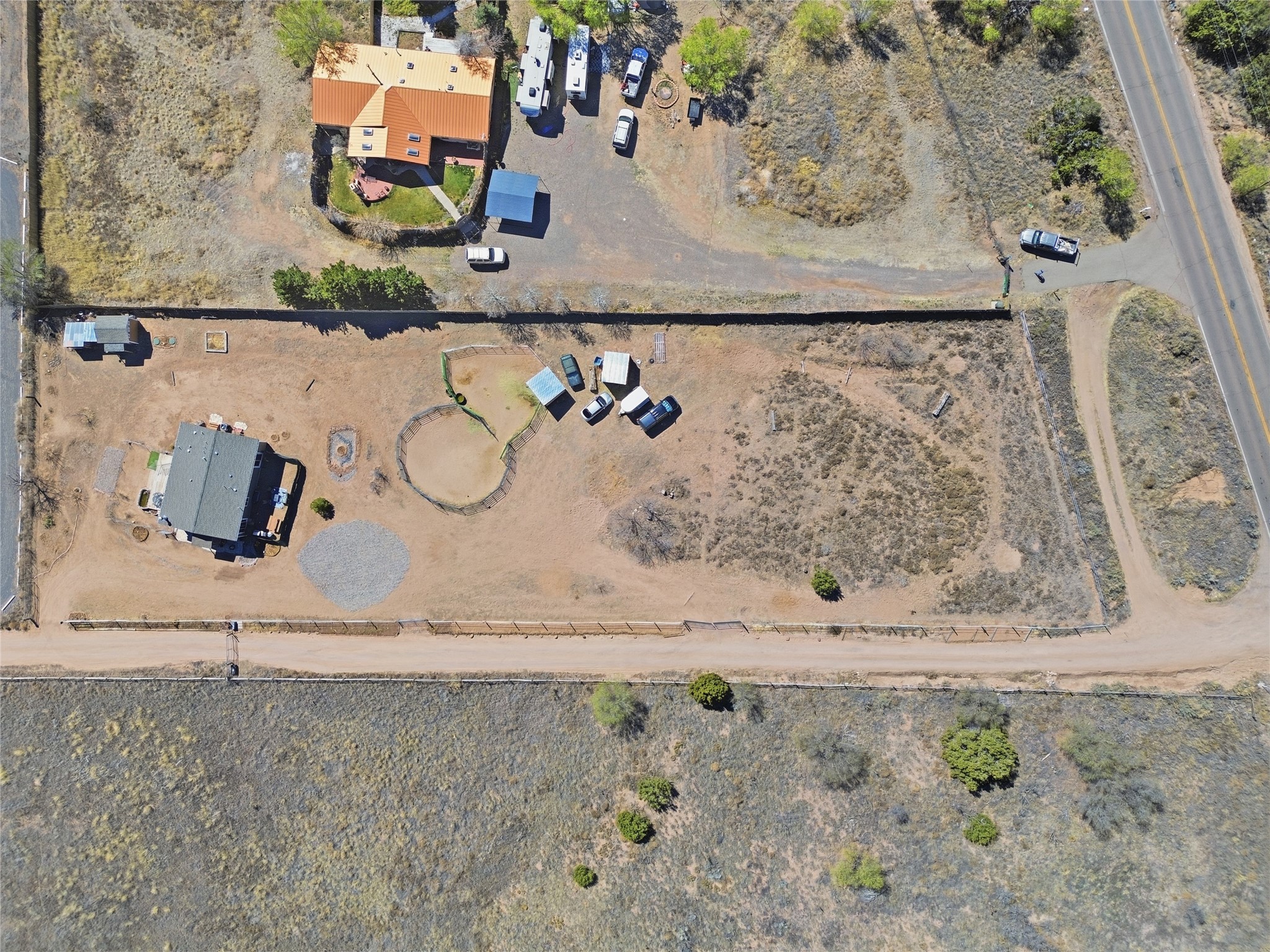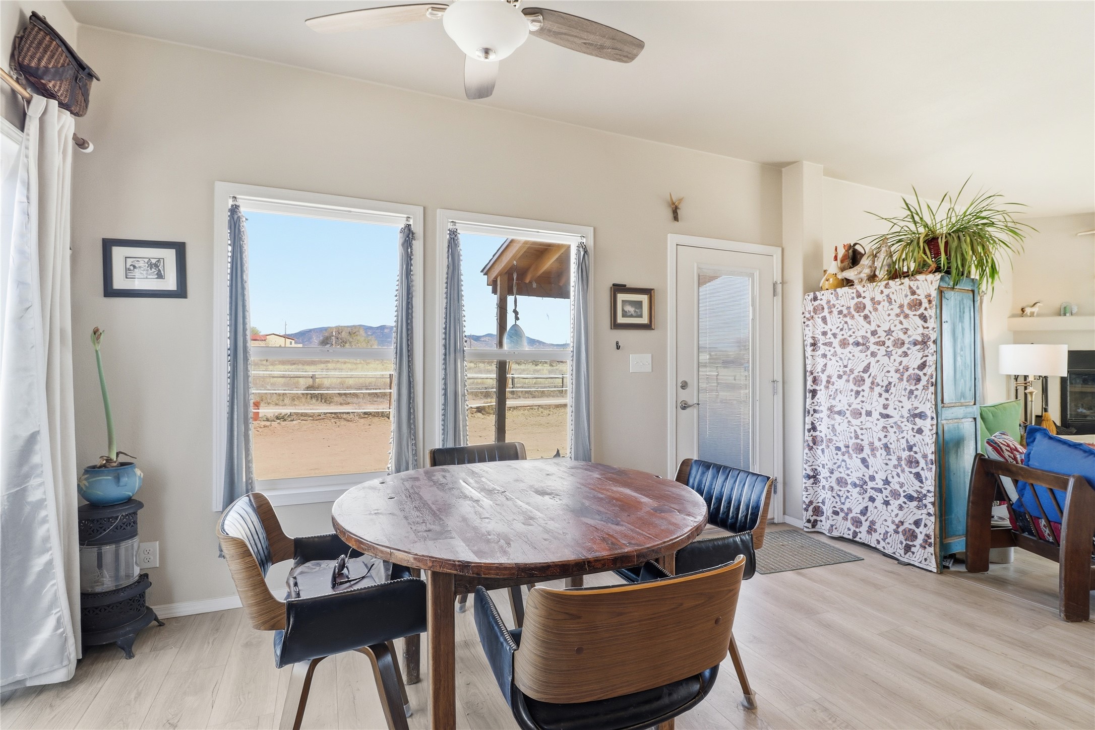 Rare opportunity to own a truly unique in-town horse property offering space, flexibility, and a touch of country living--just minutes from the Santa Fe Plaza.Set on 1.38 acres within city limits, this inviting 2-bedroom, 2-bath modular home offers a lifestyle that feels worlds away. Light pours through the home, highlighting 9-foot ceilings, a thoughtful floor plan, and clean, modern finishes with durable vinyl flooring throughout. The kitchen's tall cabinetry adds both elegance and functionality, while energy-efficient systems--including refrigerated air, and a high-efficiency water heater--ensure comfort year-round. A wood-burning fireplace brings warmth and a cozy Santa Fe touch.Step outside and discover a property that truly sets itself apart. Fully fenced and thoughtfully equipped, this horse-friendly property includes a 10x12 shed, horse panels (which convey), a chicken coop, 2 run-in sheds, and an RV power pedestal with nearby hydrant. A charming fish pond and inviting outdoor spaces create a peaceful setting to relax or entertain.Enjoy direct access to nature with pedestrian, equestrian, and utility easements leading to the nearby river trail--perfect for riding, walking, or simply enjoying the outdoors.Additional highlights include: Washer, dryer, and all appliances conveying (including microwave) Energy-efficient systems throughout Exterior-access deep crawlspace for added storage Shared well No HOAThis is a rare chance to own acreage, accommodate horses, and enjoy privacy--all while being close to the heart of Santa Fe. A truly special property with endless potential.