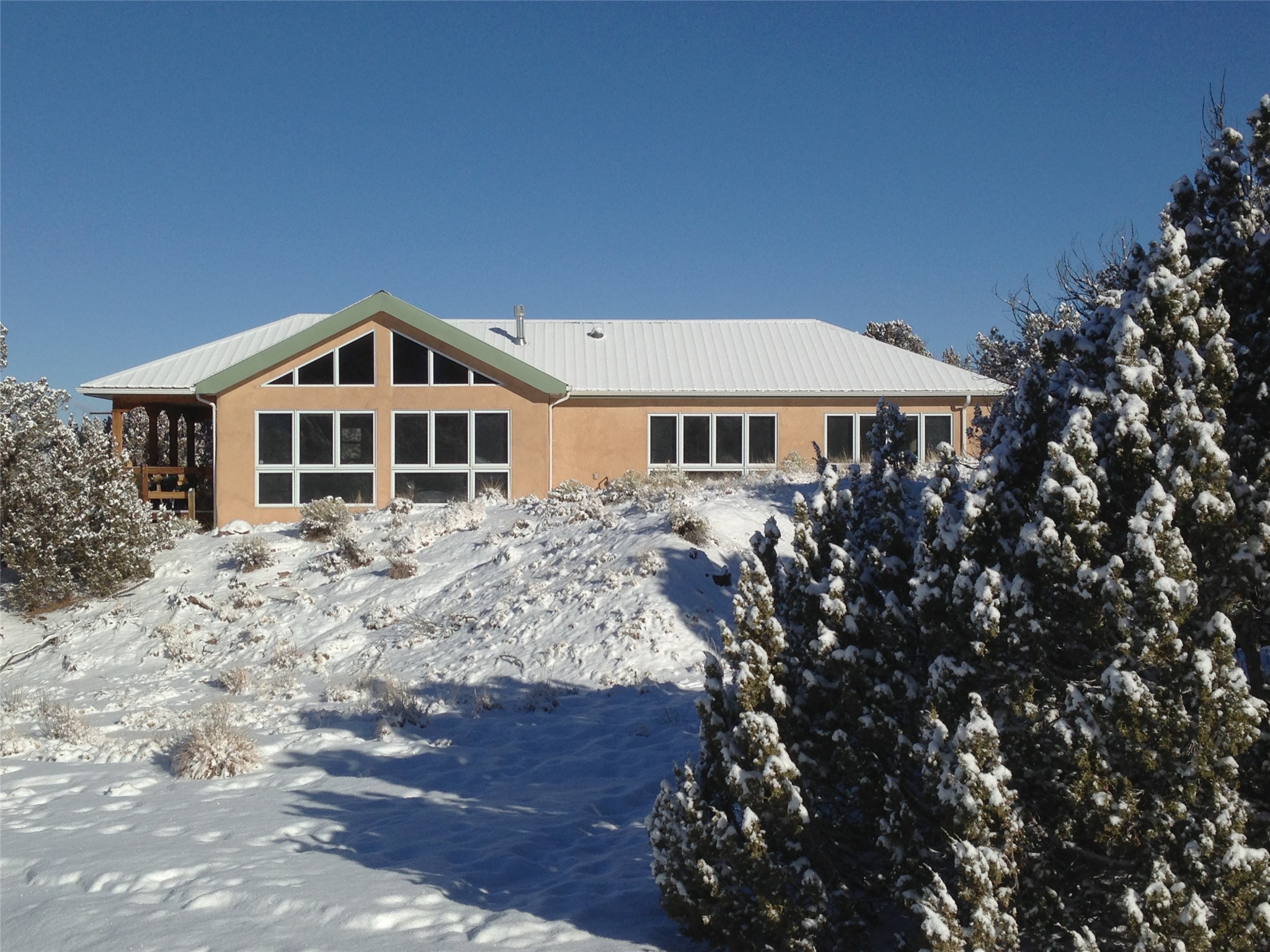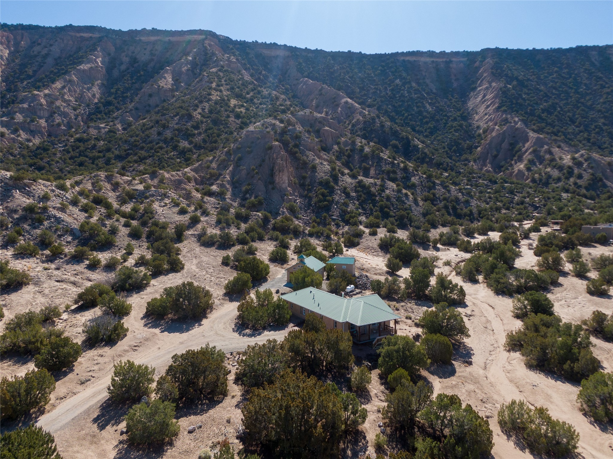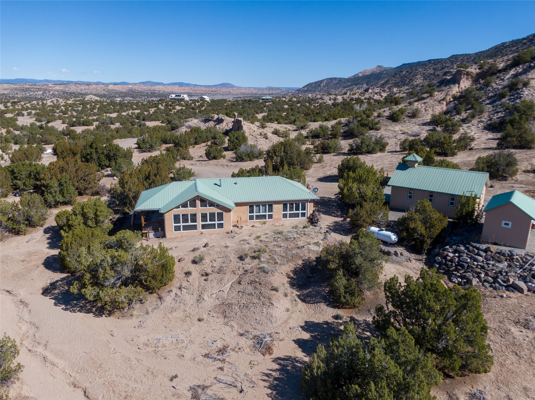 Nestled on 9 serene acres in Northern New Mexico, this lovingly maintained mountain adobe retreat offers privacy, character, and versatility. The main residence is a beautifully crafted 2-bedroom, 2-bath adobe home featuring passive solar Trombe windows with wood casings, stained concrete floors, flagstone countertops, diamond plaster walls, and tongue-and-groove vaulted ceilings. Additional highlights include gated subdivision, tiled showers, a custom built-in desk, a cozy propane gas stove--perfect for cool mountain evenings, and electric baseboard heating.The detached studio, known as the Capilla, provides a flexible space ideal for guests, creative work, or rental use. It includes electric heating, a bath, and a compact kitchen. The storage shed has electricity and is ideal for tools, small tractor and storing items from the weather.The property has served both as a peaceful second home and a successful short-term vacation rental home designed for relaxation, serving as a central hub for exploring northern New Mexico year round, including nearby mineral springs, hiking, skiing, cultural venues and festivities, and local art in Ojo Caliente, Abiquiu, Santa Fe and Taos.