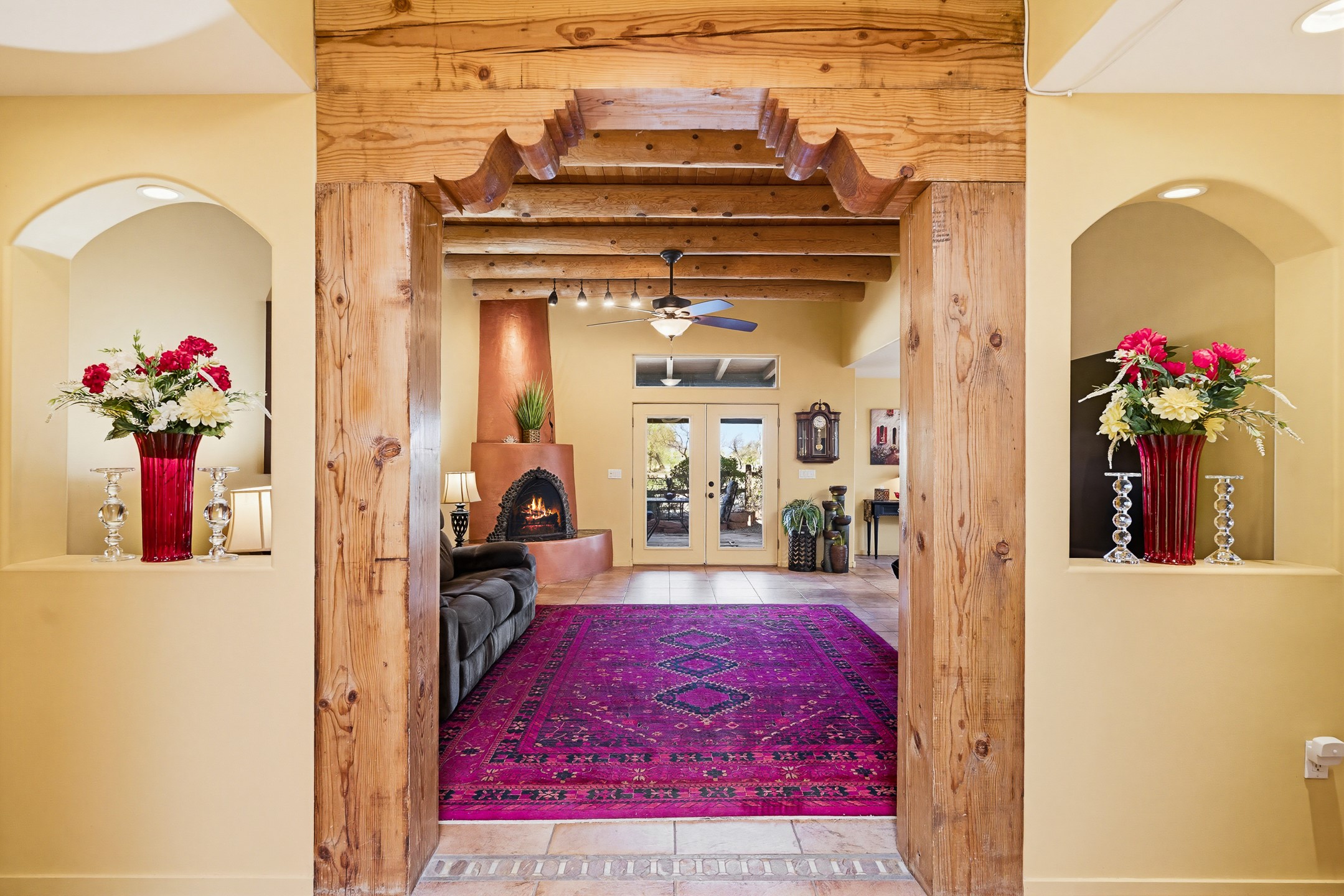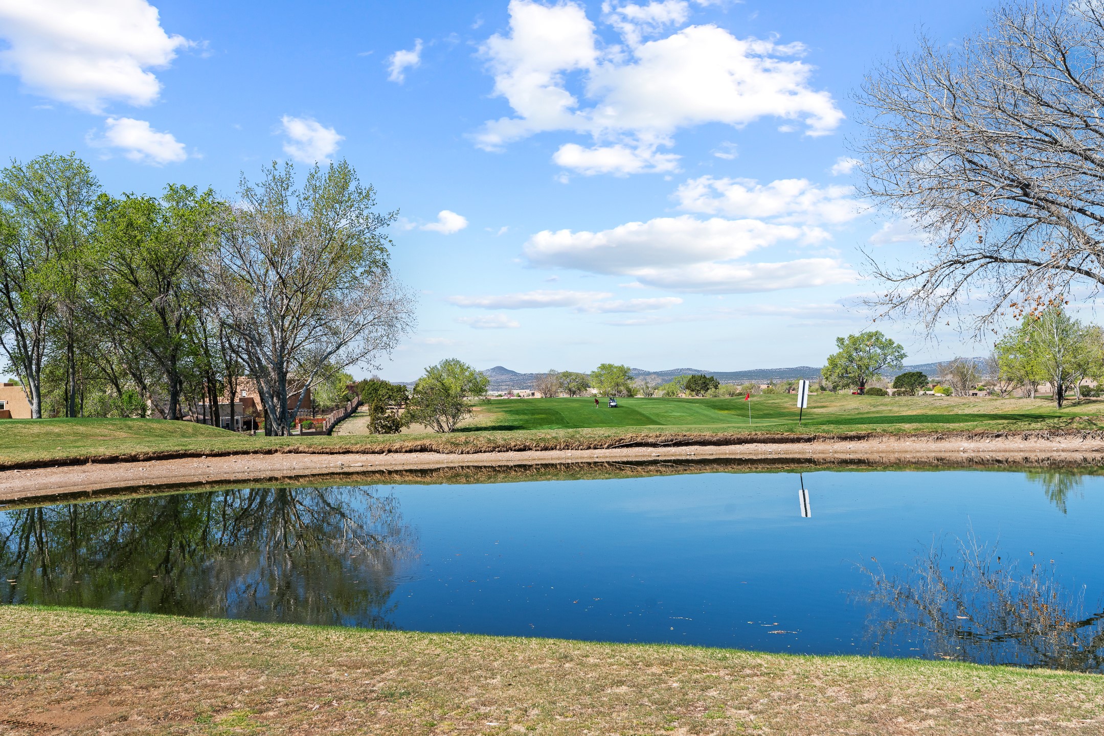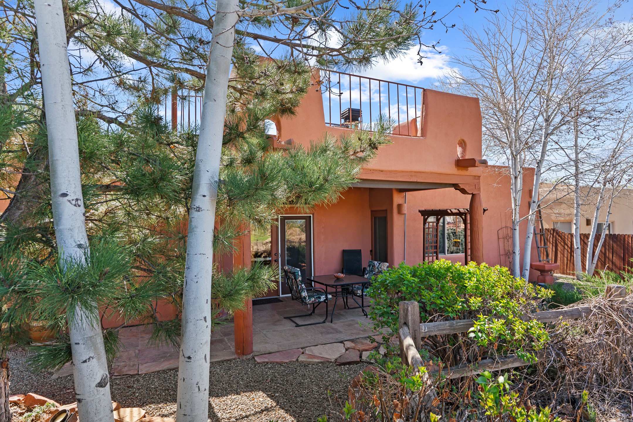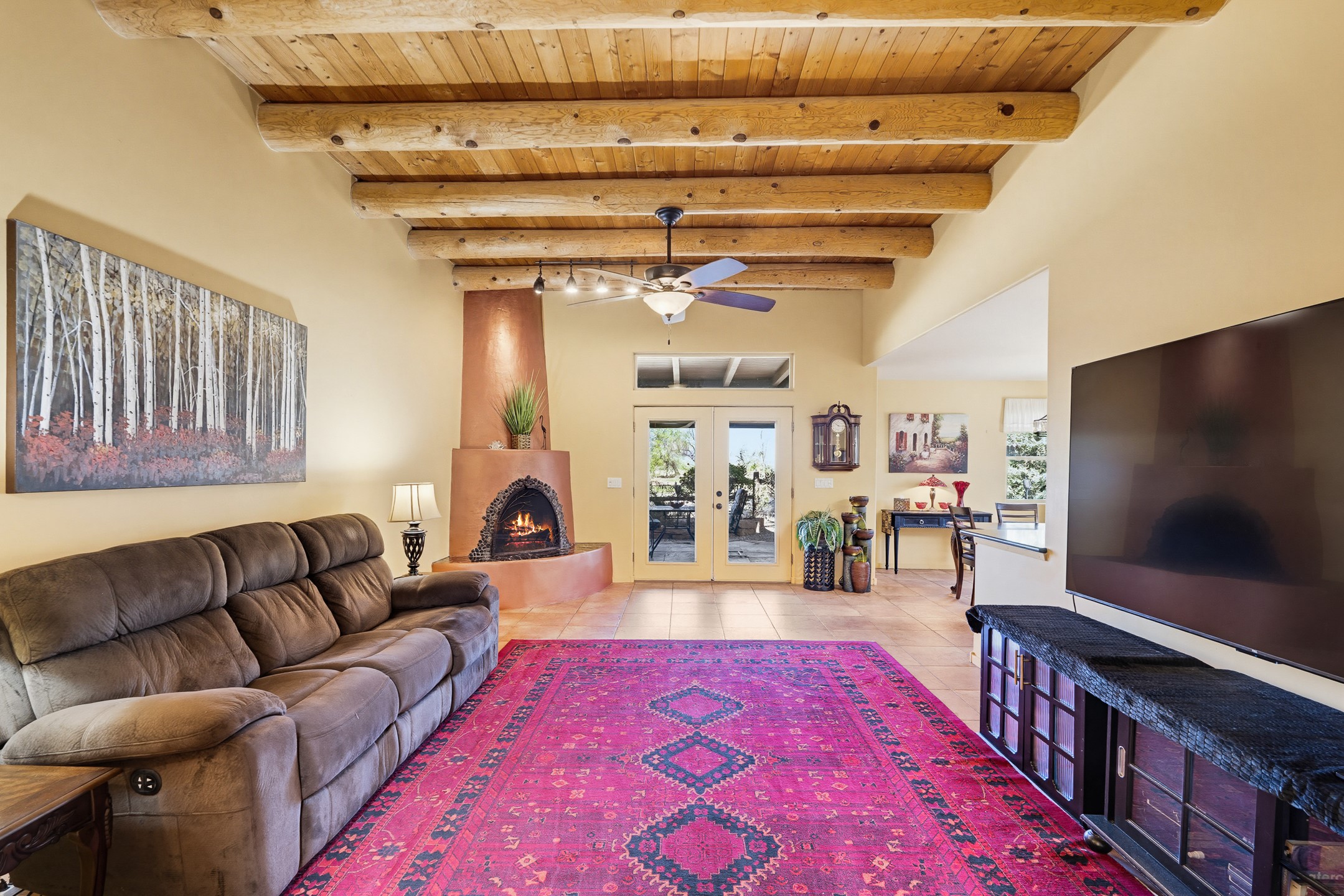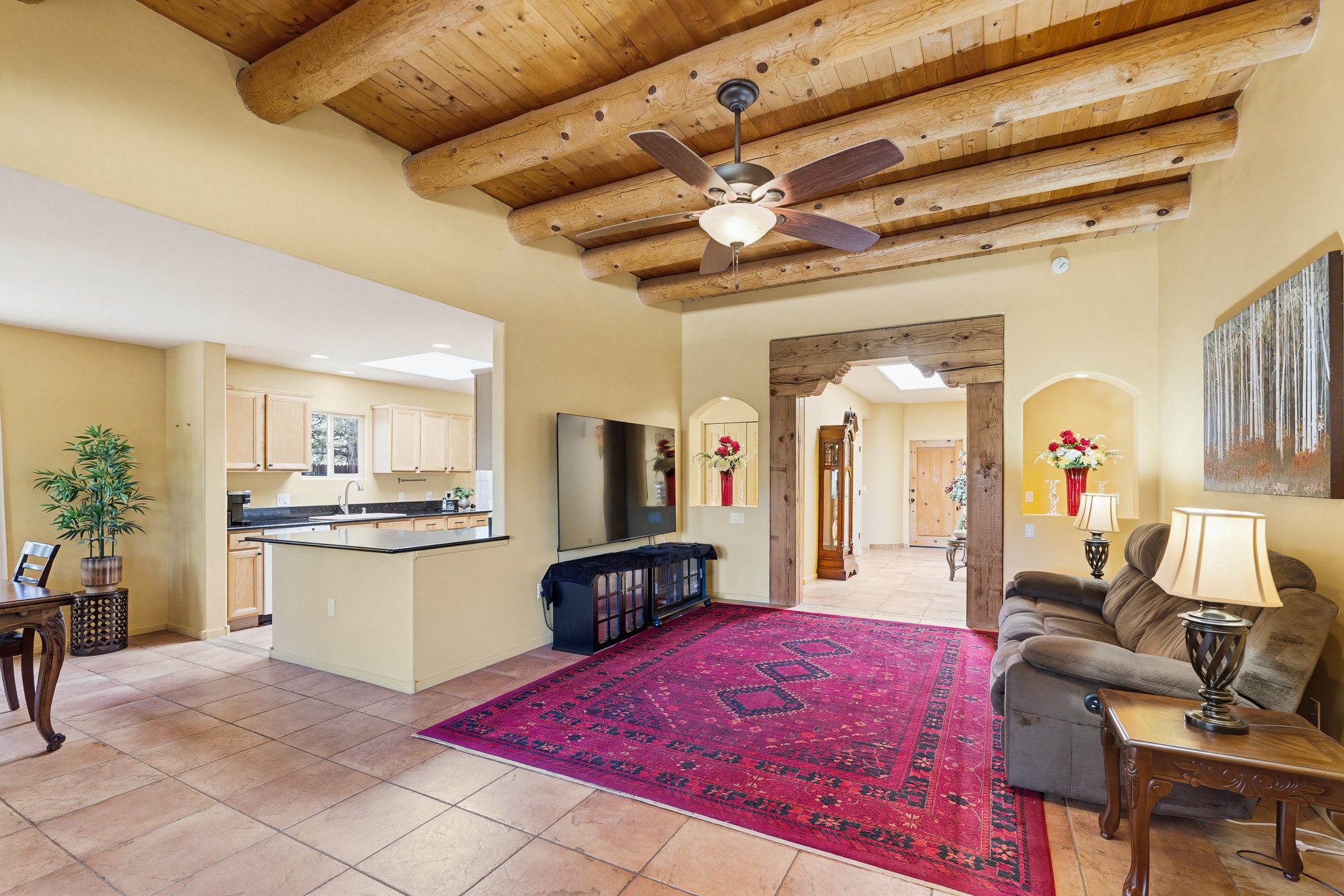 This beautifully positioned home on the 6th hole of the Country Club Golf Course offers sweeping views and a thoughtfully designed floor plan that blends comfort, privacy, and timeless Southwestern charm. The entry welcomes you with soaring ceilings and a large skylight filling the space with natural light. From here, the home unfolds effortlessly leading to a private guest wing, the kitchen, the primary suite, or into the stunning living room, framed by a beautiful beam with corbels and supported by wooden pillars. The living room is a true focal point, featuring high tongue-and-groove ceilings with exposed vigas and a striking kiva fireplace framed with a natural rock surround that adds warmth and character. French doors open to the back patio, framing the golf course views and creating an ideal indoor-outdoor living experience. The primary suite is separated from the guest bedrooms, offering a quiet retreat with direct access to the back patio. The ensuite bath includes a double sink vanity with quartz countertops, a walk-in closet, and walk-in shower. The guest bedrooms provide comfort and privacy. One bedroom features French doors that open to its own secluded patio and beautifully landscaped side yard, creating a peaceful and luxurious outdoor escape. The dining room flows seamlessly from the living area and connects to the kitchen, which features Star Clustered Black Quartz countertops and a side door leading to the lush side yard. Additional features include tile flooring throughout the main living areas, carpet in the guest bedrooms, and an energy-efficient desert evaporative cooling system that adds comfortable humidity to the dry Southwestern air. Radiant heat provides cozy warmth underfoot during the winter months. Outdoor living is just as inviting, with a back patio overlooking the golf course and a spiral staircase leading to a rooftop deck with expansive views, including a glimpse of the nearby pond. Perfect for sunset gatherings or quiet mornings.