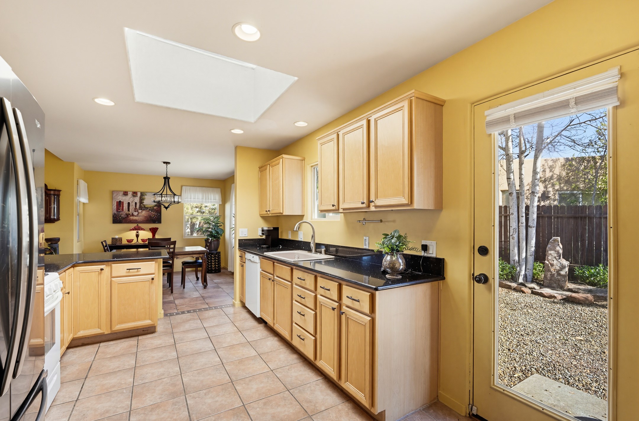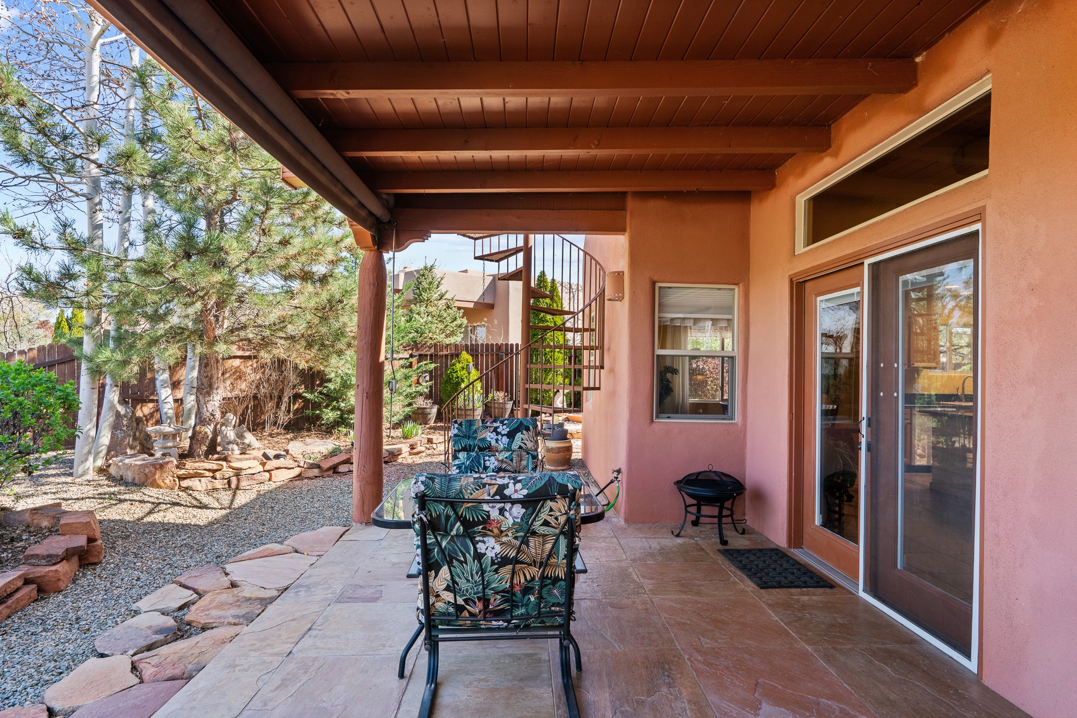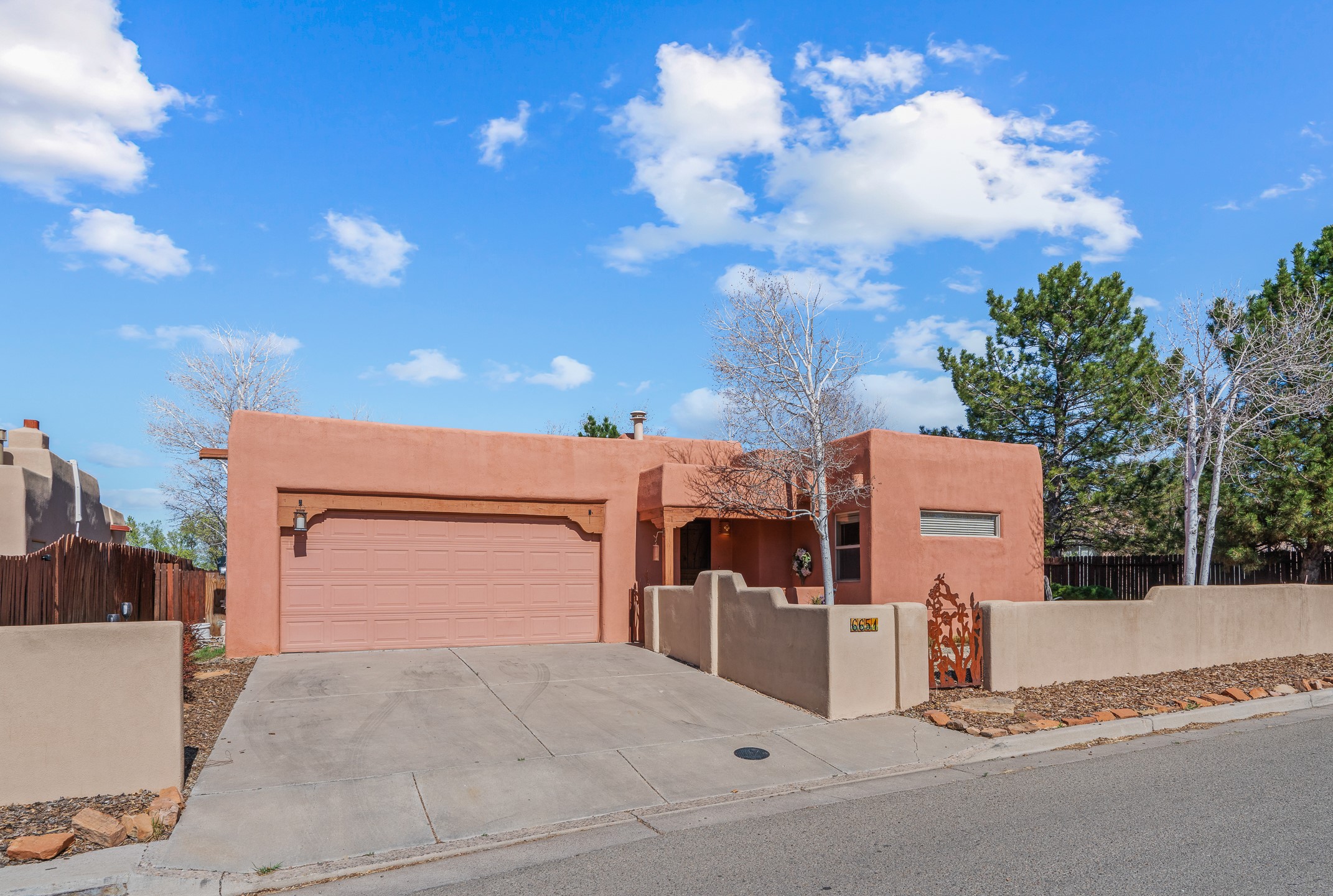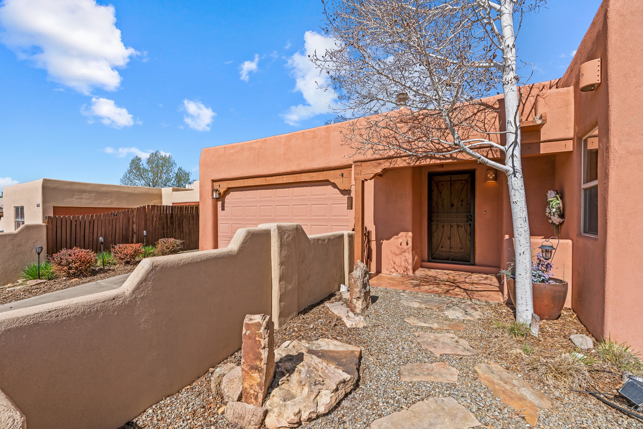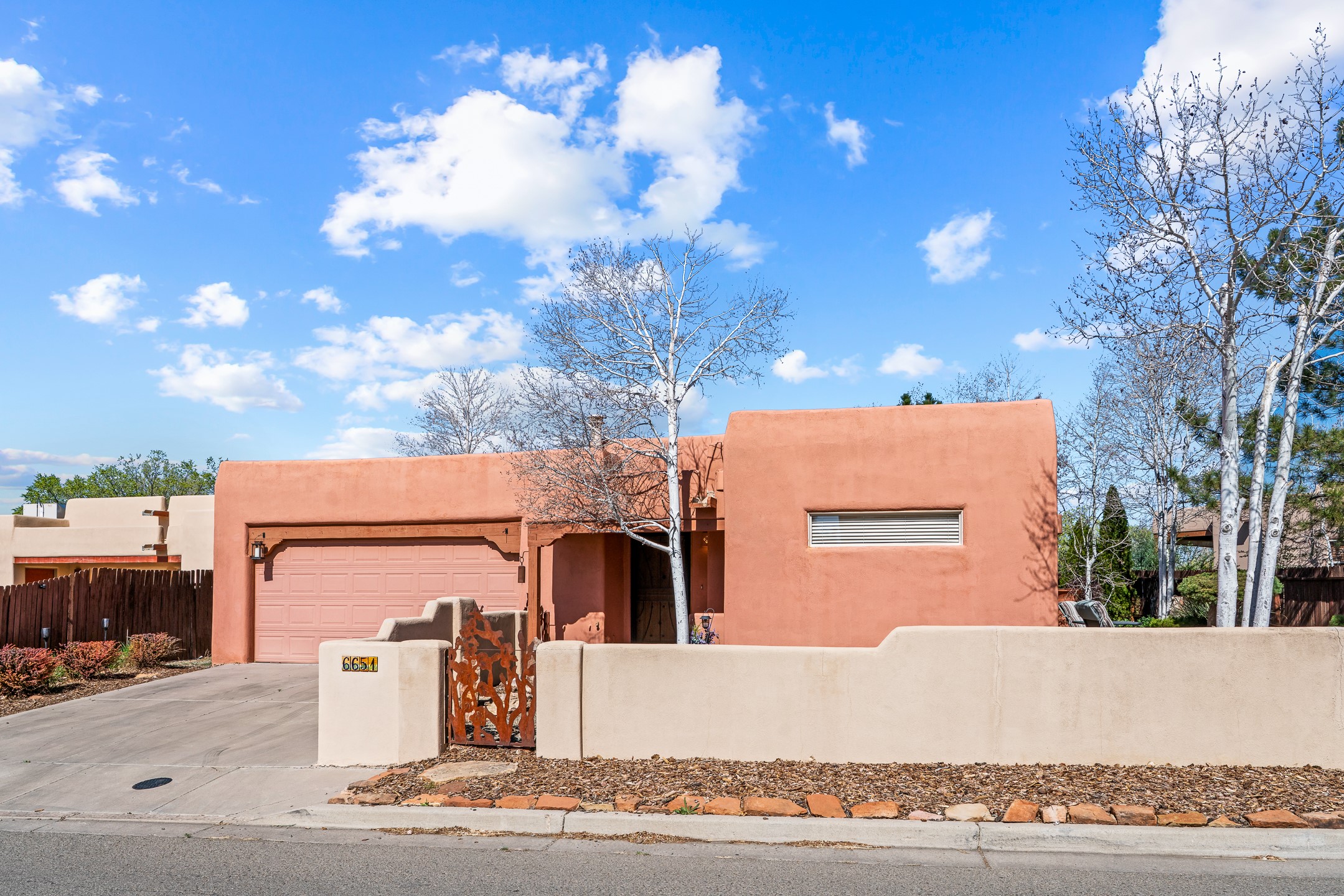 This beautifully positioned home on the 6th hole of the Country Club Golf Course offers sweeping views and a thoughtfully designed floor plan that blends comfort, privacy, and timeless Southwestern charm. The entry welcomes you with soaring ceilings and a large skylight filling the space with natural light. From here, the home unfolds effortlessly leading to a private guest wing, the kitchen, the primary suite, or into the stunning living room, framed by a beautiful beam with corbels and supported by wooden pillars. The living room is a true focal point, featuring high tongue-and-groove ceilings with exposed vigas and a striking kiva fireplace framed with a natural rock surround that adds warmth and character. French doors open to the back patio, framing the golf course views and creating an ideal indoor-outdoor living experience. The primary suite is separated from the guest bedrooms, offering a quiet retreat with direct access to the back patio. The ensuite bath includes a double sink vanity with quartz countertops, a walk-in closet, and walk-in shower. The guest bedrooms provide comfort and privacy. One bedroom features French doors that open to its own secluded patio and beautifully landscaped side yard, creating a peaceful and luxurious outdoor escape. The dining room flows seamlessly from the living area and connects to the kitchen, which features Star Clustered Black Quartz countertops and a side door leading to the lush side yard. Additional features include tile flooring throughout the main living areas, carpet in the guest bedrooms, and an energy-efficient desert evaporative cooling system that adds comfortable humidity to the dry Southwestern air. Radiant heat provides cozy warmth underfoot during the winter months. Outdoor living is just as inviting, with a back patio overlooking the golf course and a spiral staircase leading to a rooftop deck with expansive views, including a glimpse of the nearby pond. Perfect for sunset gatherings or quiet mornings.