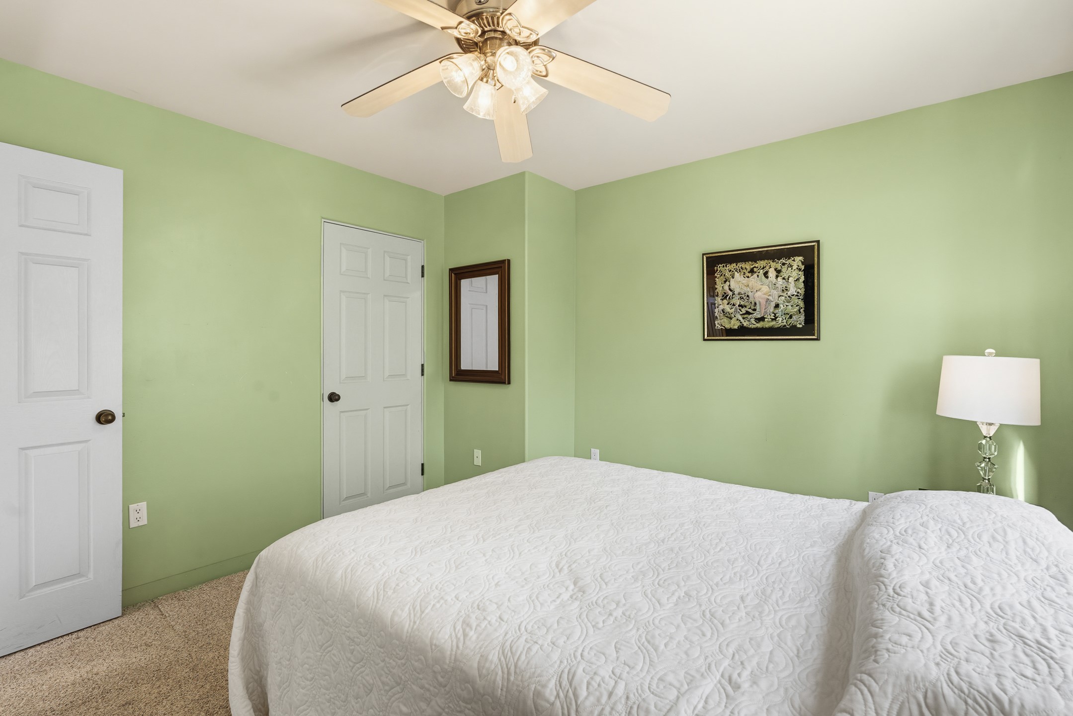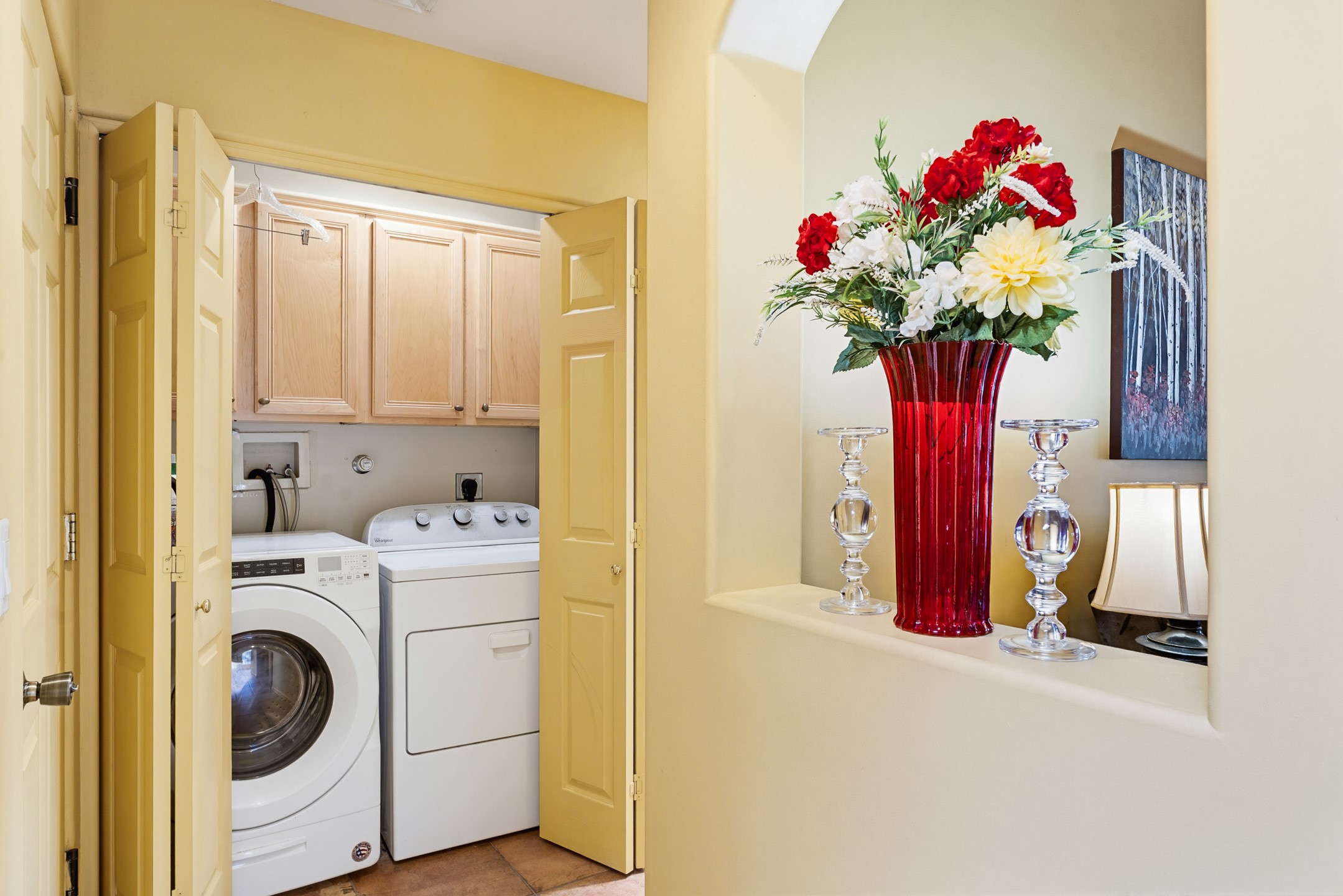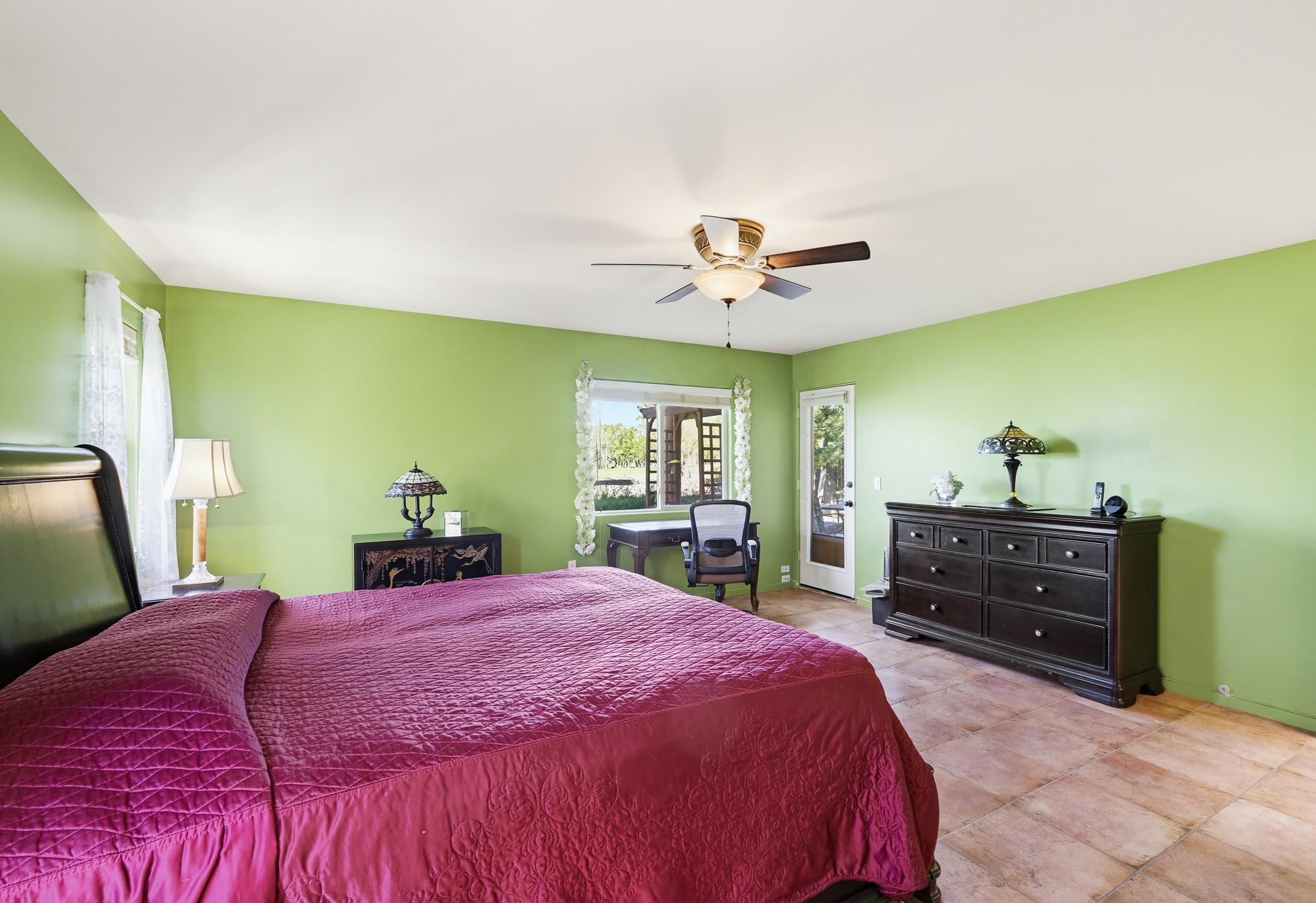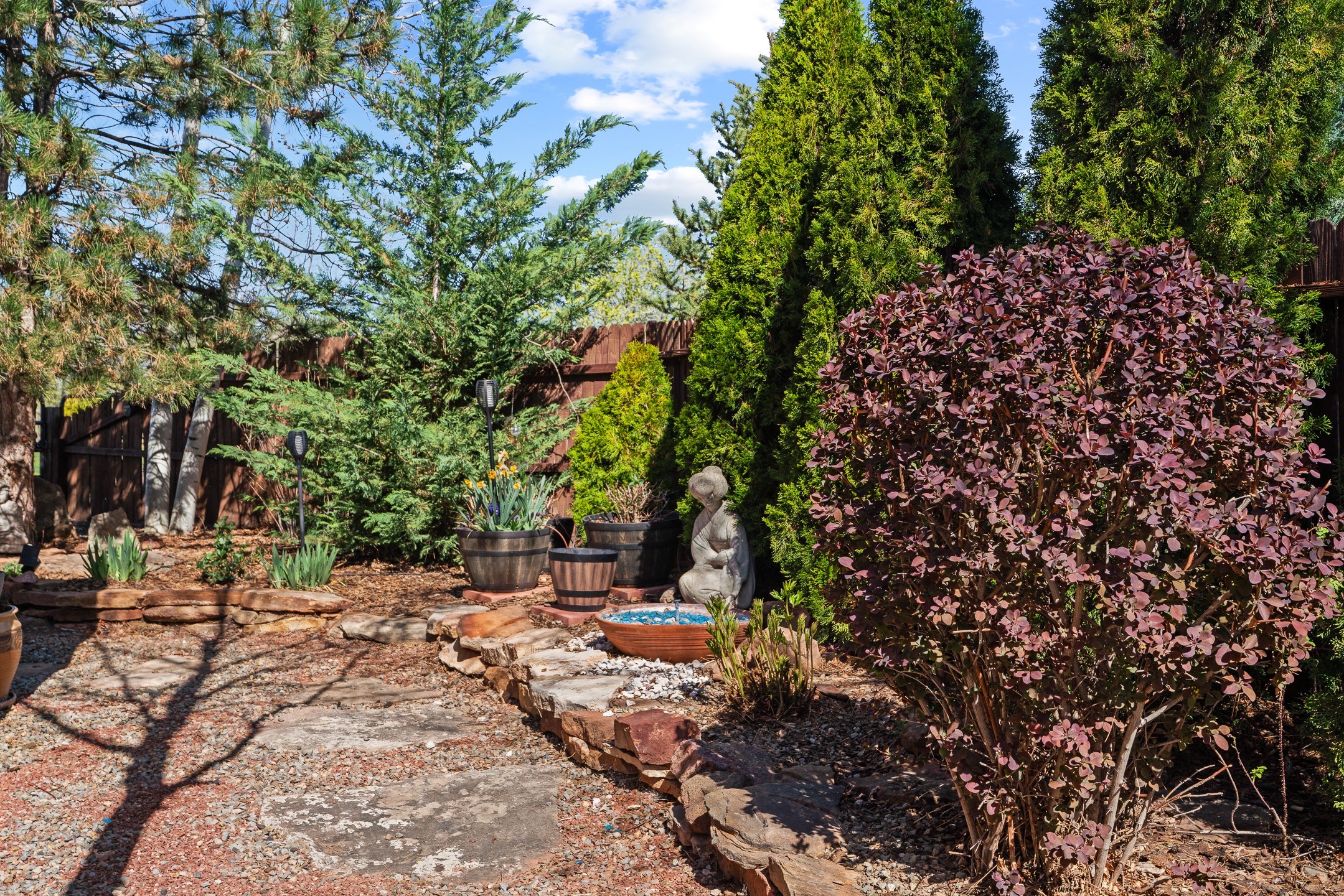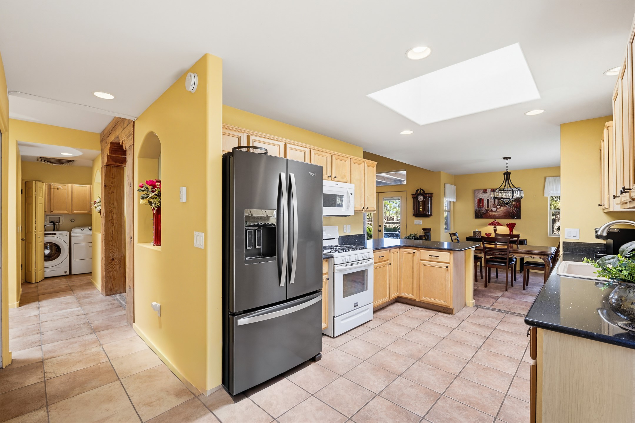 This beautifully positioned home on the 6th hole of the Country Club Golf Course offers sweeping views and a thoughtfully designed floor plan that blends comfort, privacy, and timeless Southwestern charm. The entry welcomes you with soaring ceilings and a large skylight filling the space with natural light. From here, the home unfolds effortlessly leading to a private guest wing, the kitchen, the primary suite, or into the stunning living room, framed by a beautiful beam with corbels and supported by wooden pillars. The living room is a true focal point, featuring high tongue-and-groove ceilings with exposed vigas and a striking kiva fireplace framed with a natural rock surround that adds warmth and character. French doors open to the back patio, framing the golf course views and creating an ideal indoor-outdoor living experience. The primary suite is separated from the guest bedrooms, offering a quiet retreat with direct access to the back patio. The ensuite bath includes a double sink vanity with quartz countertops, a walk-in closet, and walk-in shower. The guest bedrooms provide comfort and privacy. One bedroom features French doors that open to its own secluded patio and beautifully landscaped side yard, creating a peaceful and luxurious outdoor escape. The dining room flows seamlessly from the living area and connects to the kitchen, which features Star Clustered Black Quartz countertops and a side door leading to the lush side yard. Additional features include tile flooring throughout the main living areas, carpet in the guest bedrooms, and an energy-efficient desert evaporative cooling system that adds comfortable humidity to the dry Southwestern air. Radiant heat provides cozy warmth underfoot during the winter months. Outdoor living is just as inviting, with a back patio overlooking the golf course and a spiral staircase leading to a rooftop deck with expansive views, including a glimpse of the nearby pond. Perfect for sunset gatherings or quiet mornings.